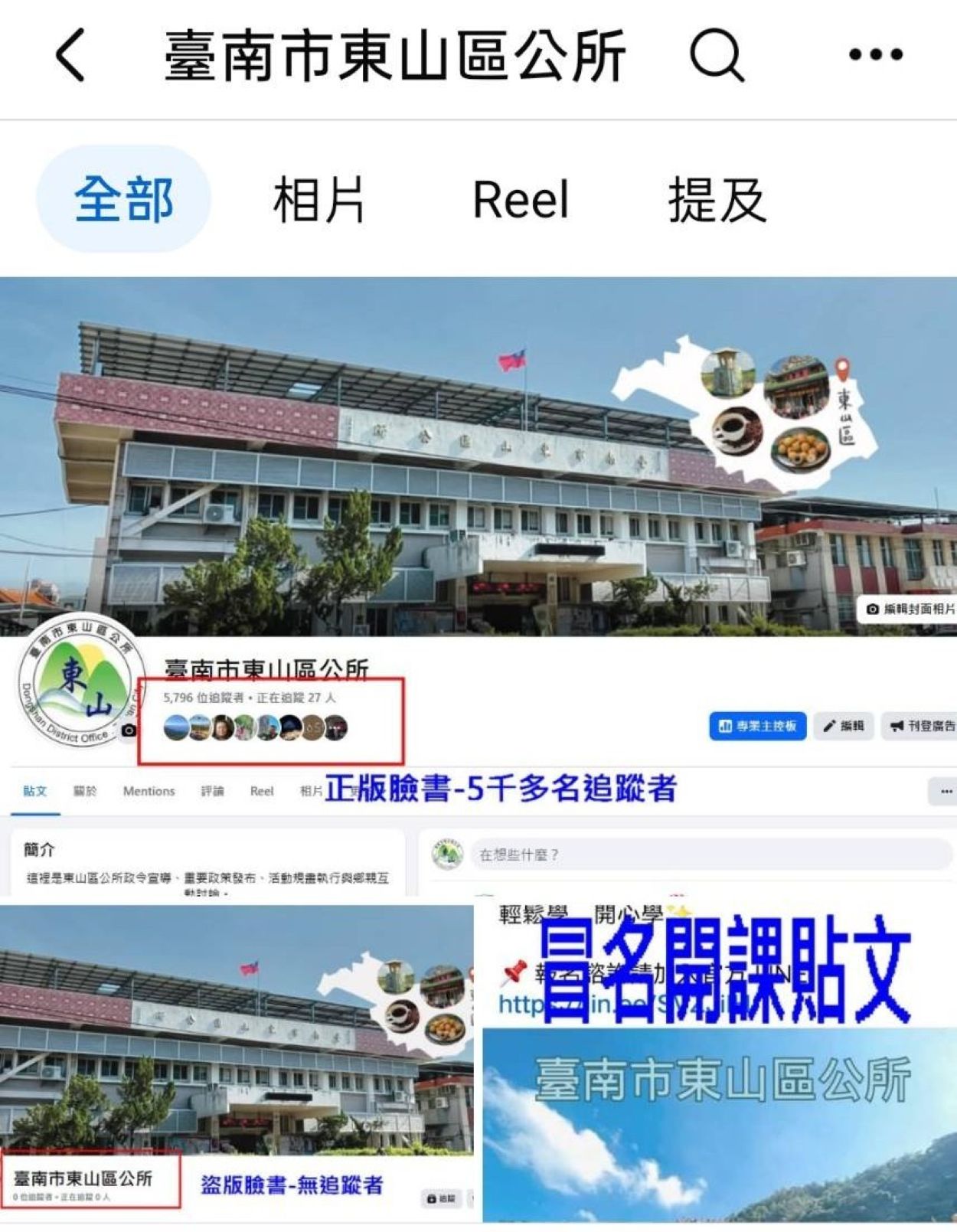 區長張政郎強調,真實版的台南市東山區公所官方粉絲專頁有五千多名追蹤者,冒名刊登課程招生訊息的盜版東山區公所官方粉絲專頁沒有追蹤者,公所特此公告,並呼籲大家切勿上當受騙。