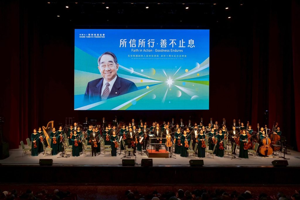 「所信所行、善不止息」長榮集團創辦人張榮發辭世十周年紀念音樂會,由長榮交響樂團駐團指揮莊文貞擔綱指揮,率領樂團用音樂帶領全場觀眾穿越時空,向這位航運巨人致敬。(長榮集團提供)