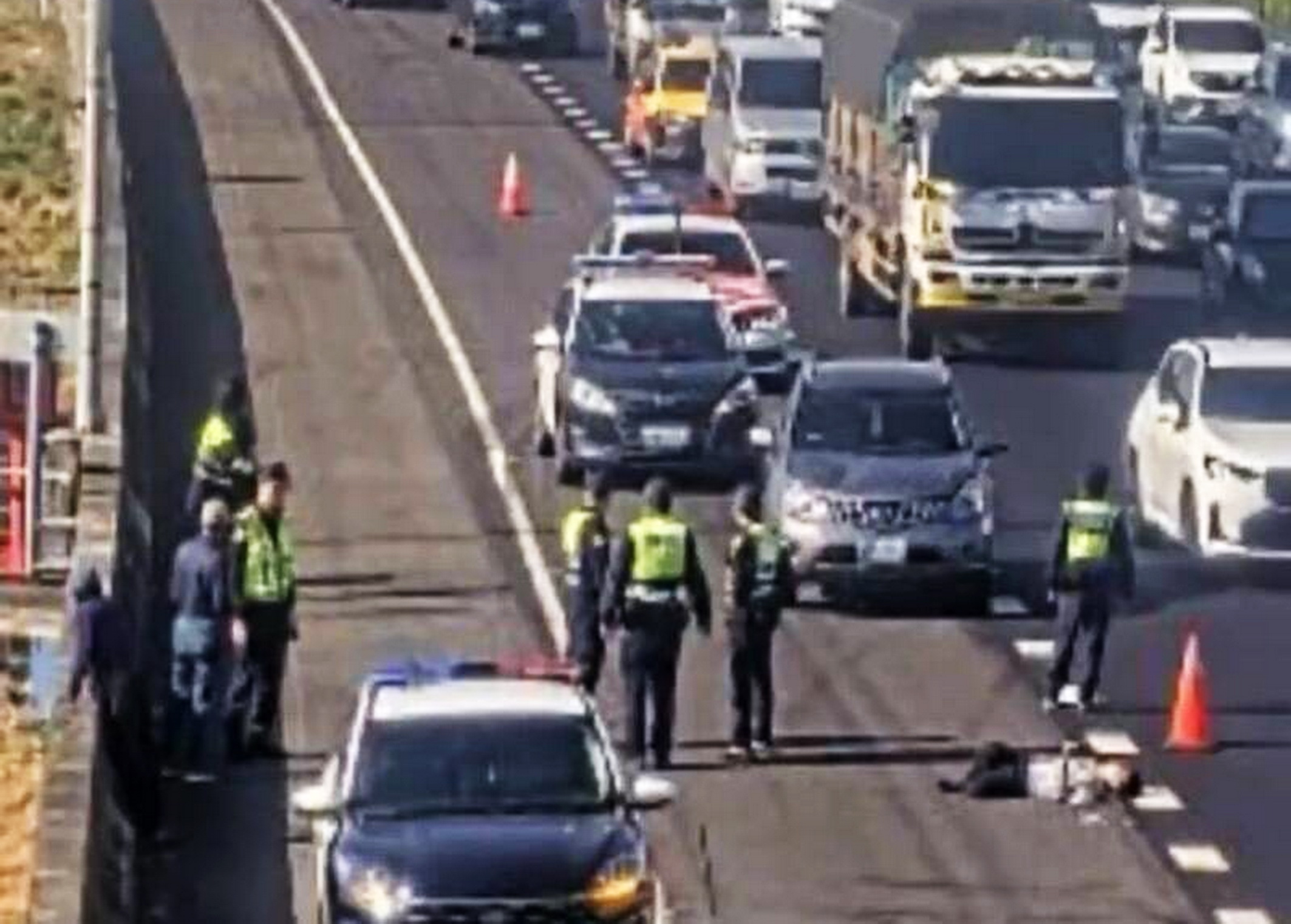 涉案的張男徒步逃逸至國道一號北上一七四點九公里處(台中大雅路段),遭車輛撞擊雙腳骨折後倒臥地面,警消趕到現場將他戒護送醫。