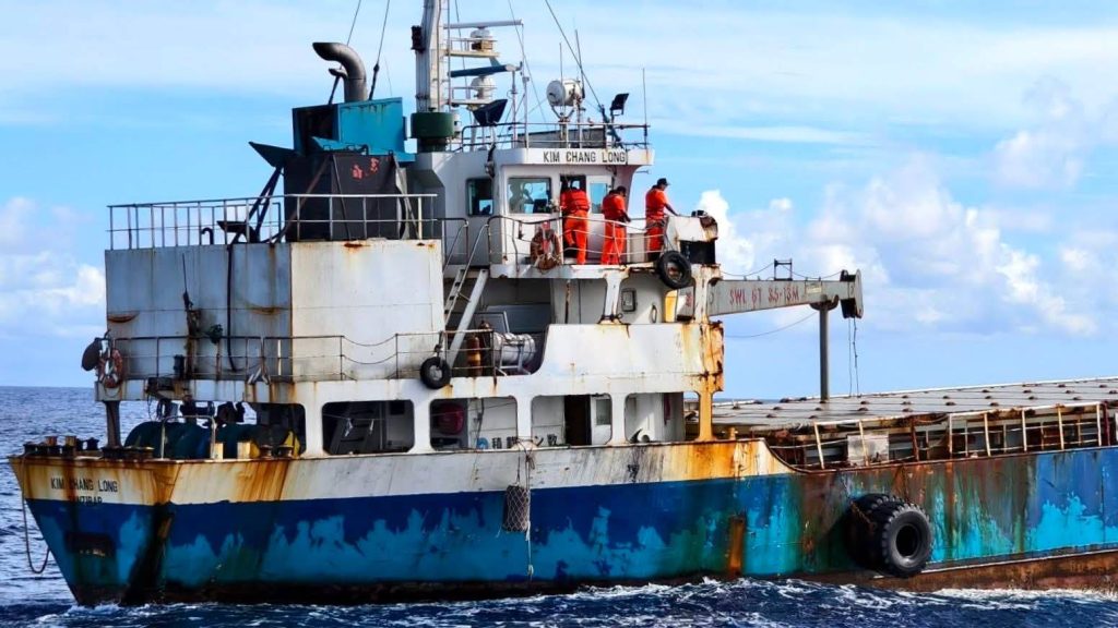 坦尚尼亞籍「KIM CHANG LONG」雜貨輪被海巡查獲近1300公斤毒品。(記者陸瓊娟翻攝)