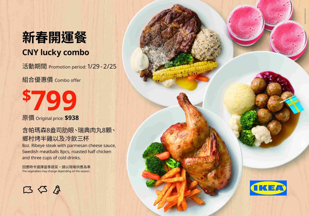 除了春節限定湯品,即日起至2月25日IKEA也有兩款新春超值優惠餐,首先登場的「新春分享餐」,兩份主餐包含象徵圓滿吉利的脆皮豬腳佐德國酸菜、配上綿密鬆軟的雙色地瓜塊,以及能夠一次嚐遍瑞典肉丸、雞肉丸及植物素肉丸,三種口味的大三元吉利丸,再加上冷飲兩杯,組合優惠價$599(原價$648,現省$49),適合兩人共享、輕鬆團圓。想要更豐盛的還有「新春開運餐」,一次端上帕瑪森 8 盎司肋眼牛排、IKEA 經典瑞典肉丸8顆、鄉村烤半雞等奢華主餐,搭配冷飲三杯,優惠價$799(原價$938,現省$139),不論是家庭聚餐或好友相約,都能在新年花小錢又吃得澎湃滿足。更多各店活動詳情,請見IKEA瑞典餐廳官網 (https://www.ikea.com.tw/zh/ikea-food/restaurant)。