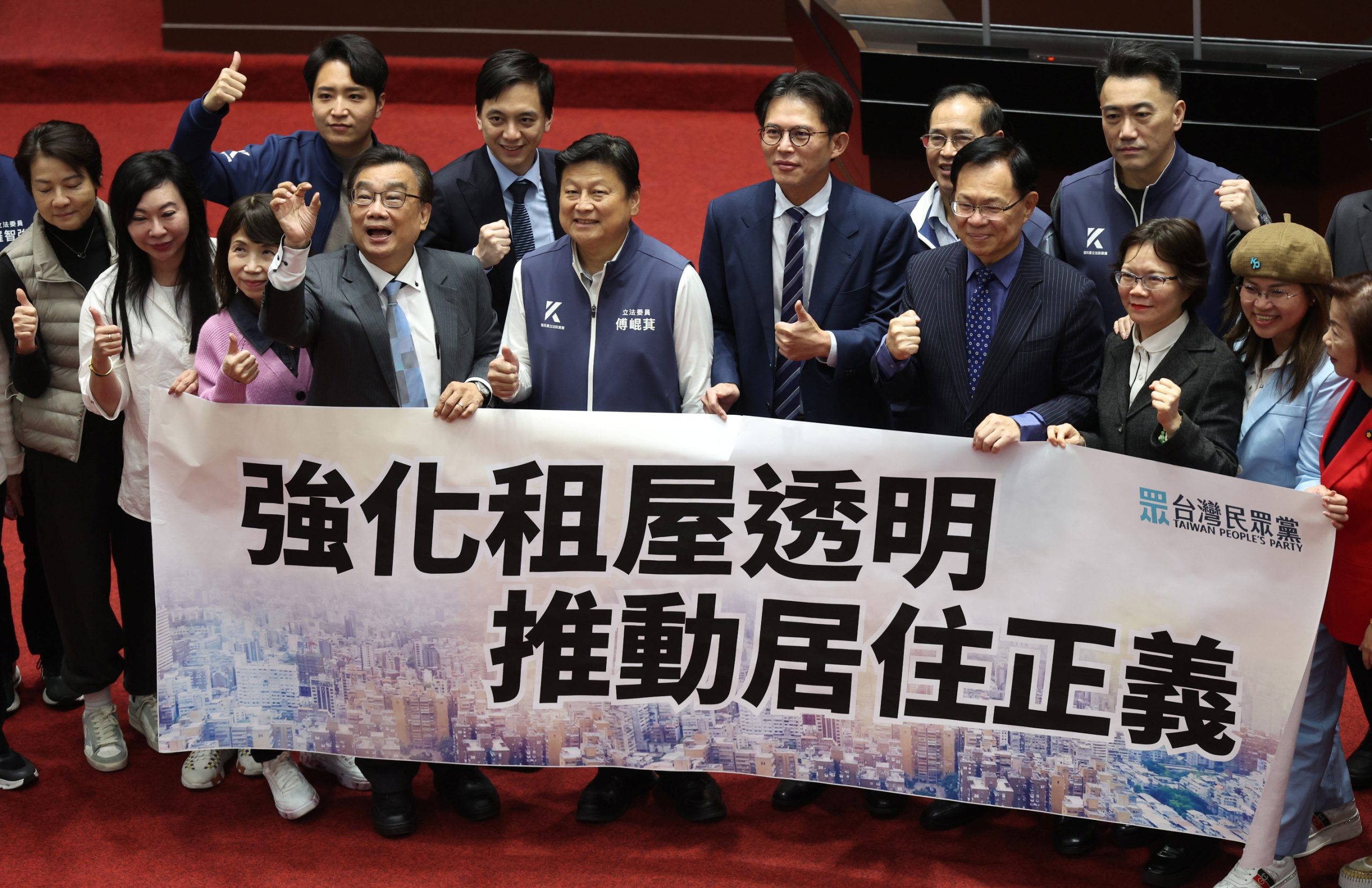 立法院會三十日處理住宅法部分條文修正草案並進行投票表決,國民黨團總召傅崐萁(前左五)、民眾黨團總召黃國昌(前右五)與藍白立委於議場內拉布條合影,呼籲推動居住正義。(中央社)