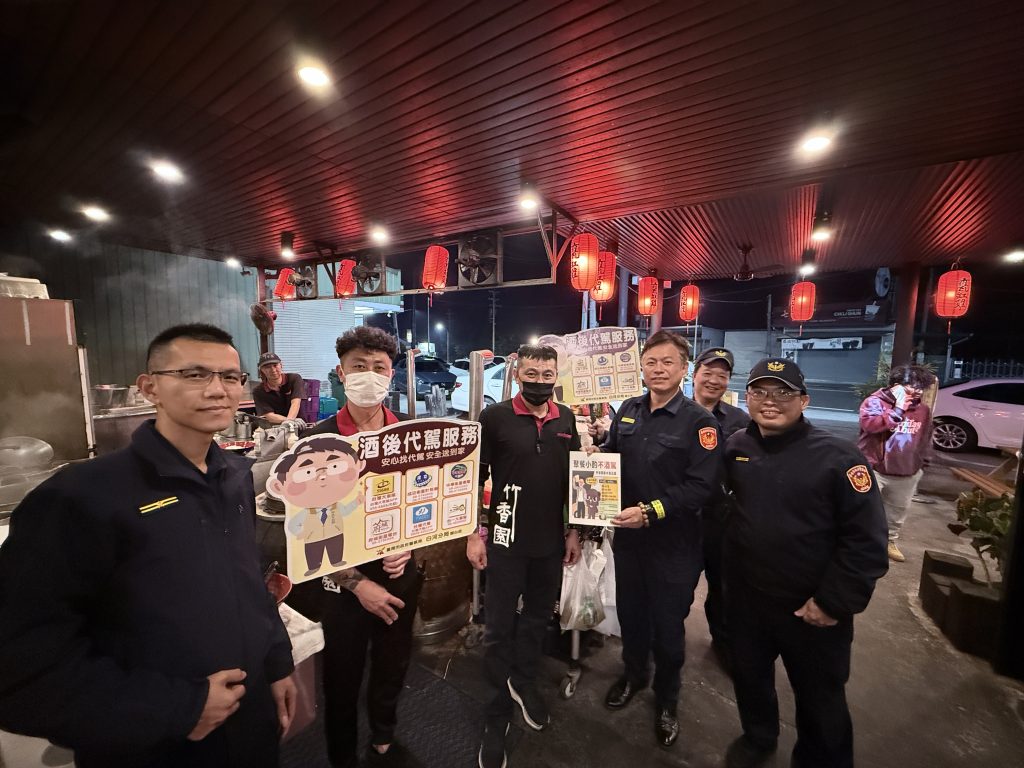 陳志埕率隊走訪轄內各餐飲名店,逐桌向用餐民眾發放宣導品,提醒指定駕駛最靠譜,席間若有飲酒,應落實「指定駕駛」制度;代駕接送更安心,鼓勵利用手機App預約代駕,或請店家協助聯繫計程車。