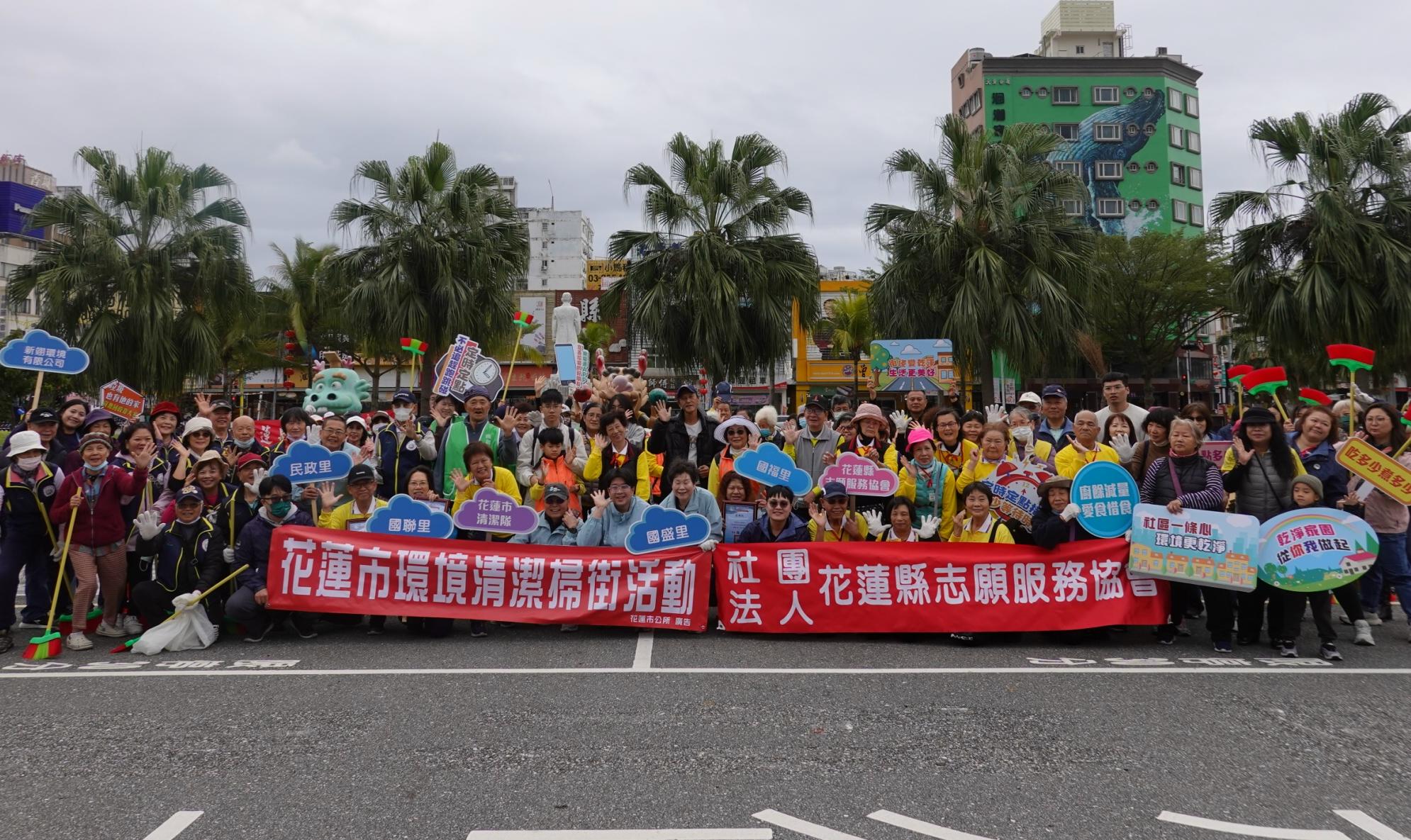 花蓮市公所表示,農曆春及即將到來,為維護市容環境整潔,花蓮縣志願服務協會長期認養花蓮車站前廣場,固定於每月第一個週日清晨號召志工展開掃街行動。