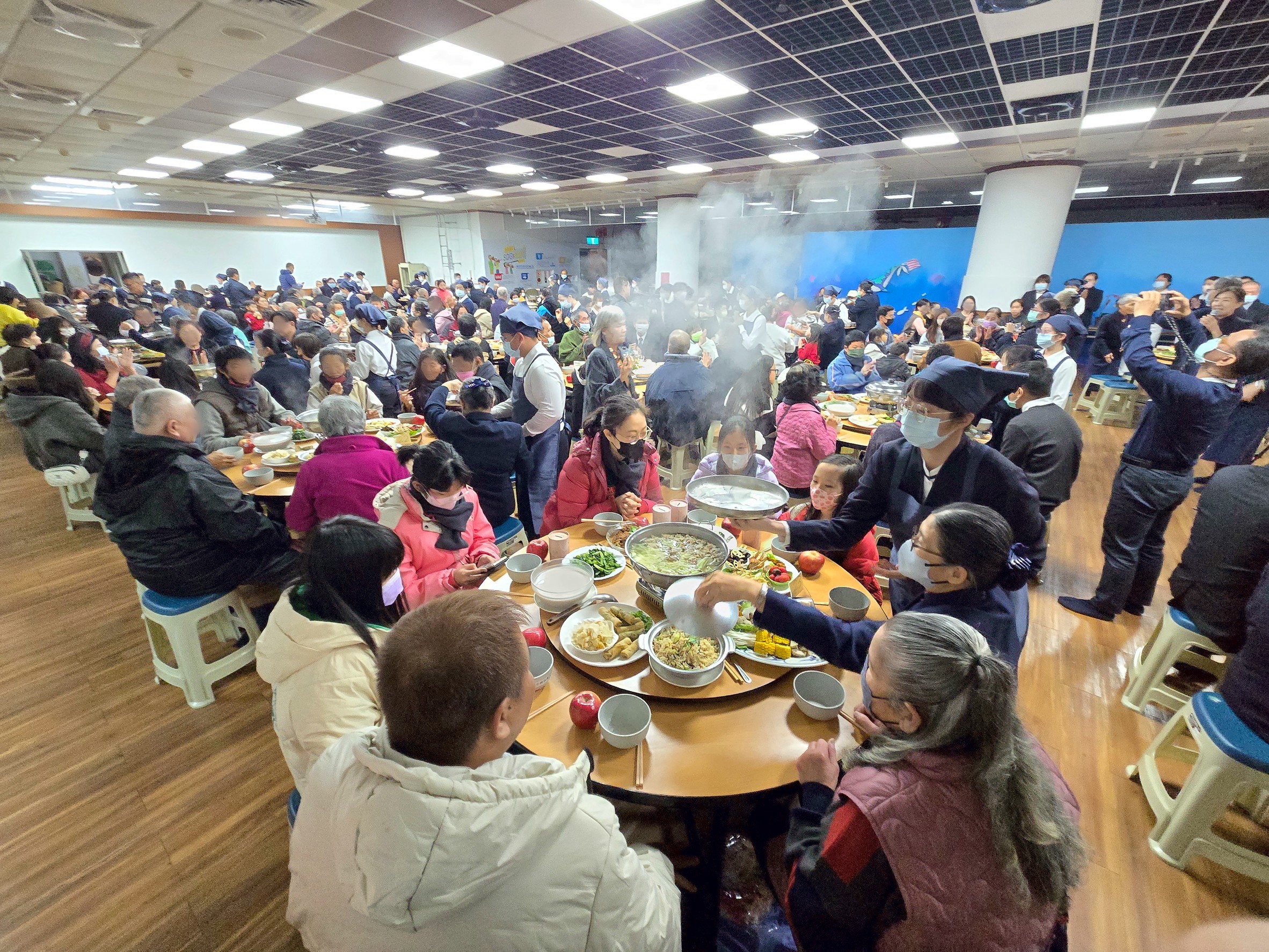 台南慈濟關懷一千四百八十四戶弱勢家庭及獨老,一日上午在台南靜思堂、佳里聯絡處、安平聯絡處、新營共修處同時舉行冬令發放暨圍爐活動,共席開一百五十五桌。除了領取「福慧紅包」發放年節物資及祝福禮給照顧戶,並安排義診、義剪、各式應景表演及攤位,讓照顧戶提前感受過年氣氛。慈濟長期關懷的照顧戶也分享他們的歷程與感恩。