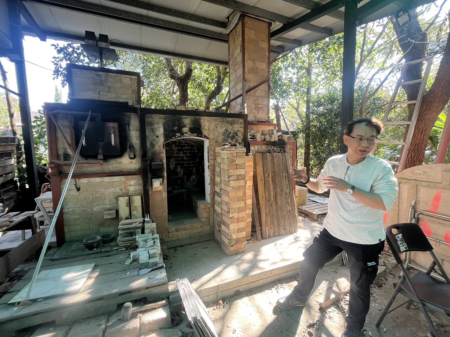 國際級天目釉燒陶藝家張桂維,近年隱身台南楠西曾文水庫附近設工作室,還邀日本知名建窯專家日下部正和蓋了一座專業、獨家的「無煙窯」。由於他一向熱心推介台灣的陶藝作品至國際展出,這次吸引同業推介法國藝術家阿妮絲哈庫斯與他認識,他熱情提供自己的工作室讓阿妮絲在此駐地創作。