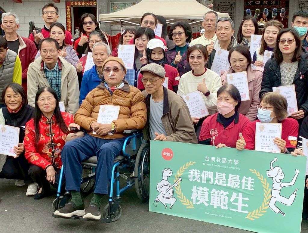 社大台江分校「大廟興學」教學博覽會,六百多人親師生齊集海尾朝皇宮,以廟口做為公民藝術舞台,以音樂舞蹈謝神、寫春聯送平安,同時表揚一百多位台江分校班代及模範生,最令人感動的是女兒陪著中風的父親報名台江村廟樂團,一起學習二胡,父女共學精神獲頒模範生獎。