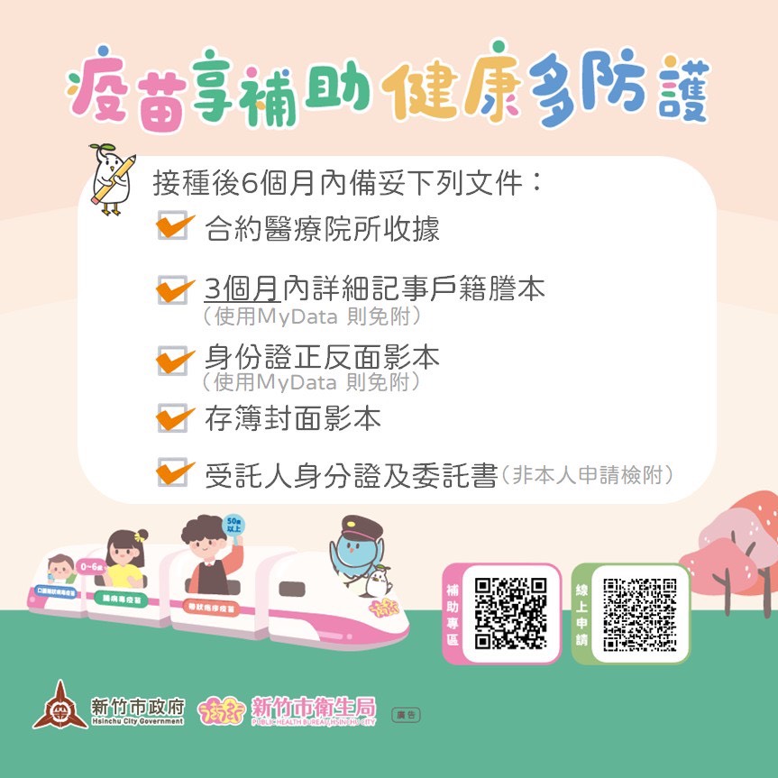 為便利施打,新竹市衛生局已與六十六家合約醫療院所合作,不分族群皆可申請補助費用,接種後六個月內備妥合約醫療院所開立收據正本、三個月內含詳細記事戶籍謄本、匯款存摺封面影本、申請人身分證正反面影本、印章等,即可臨櫃至衛生局十樓疾病管制科辦理,或至線上申辦平台( https://dgservice.hccg.gov.tw/serviceNotice.do?rule=guest&id=1201&ca )申請。有關竹市自費疫苗補助詳細資訊,請上新竹市衛生局網站( https://dep.hcchb.gov.tw查詢,或撥打一九九九市民服務專線洽詢。