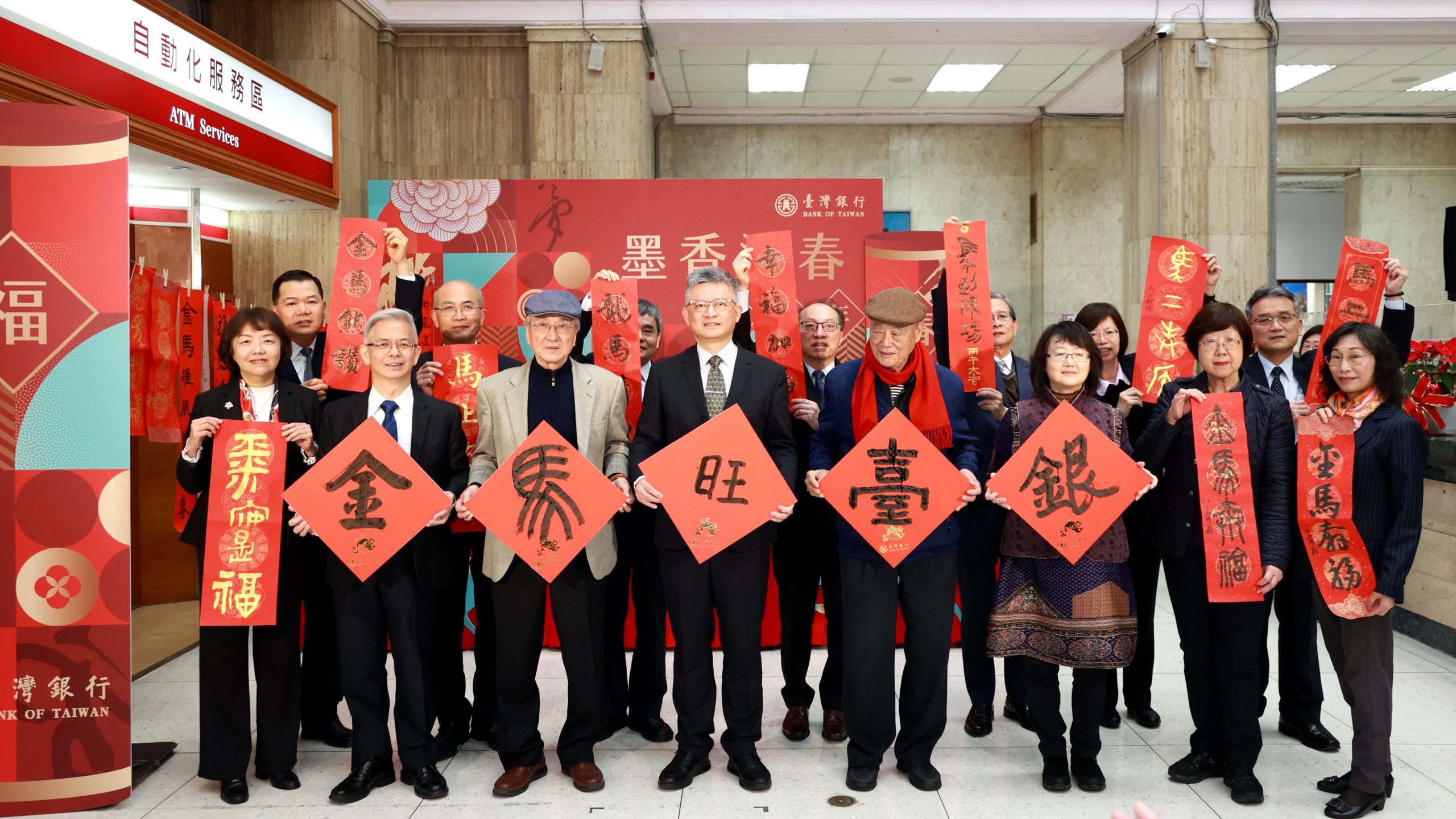 迎接農曆馬年新春,臺灣銀行於2月2日至3日在總行營業大廳舉辦「墨香迎春賀新年」揮毫贈春聯活動,透過書法藝術結合年節文化,與民眾一同辭舊迎新,營造濃厚且溫馨年節氣氛。活動由該行吳佳曉總經理,偕同書法名家薛平南、連勝彥、楊旭堂及連瑞芬聯袂主持開筆儀式,書寫寓意吉祥的「金馬旺臺銀」,象徵新的一年馬到成功、福運齊聚,為活動揭開熱鬧序幕,筆墨之間蘊含祝福與期許,展現傳統書藝的深厚底蘊,獲得現場民眾熱烈掌聲。