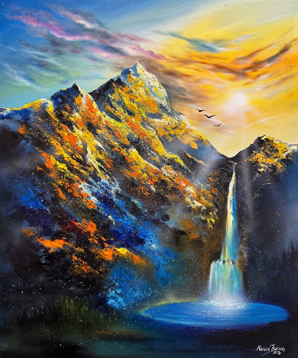 曾啟文的風水藝術創作,深深根植於台灣靈山秀水的埔里。他以巍峨山勢、流動水脈與瞬息萬變的光影,呼應風水哲學中「重山復水」的意象,象徵穩固根基與生生不息的循環。作品如《藏風聚氣 福澤長存》、《金色山脈 飛瀑聚財》,捕捉日夜更迭間的光線流轉,寓意能量的祝福與祥瑞的降臨,使觀者在畫前感受自然與心靈的和諧共振。