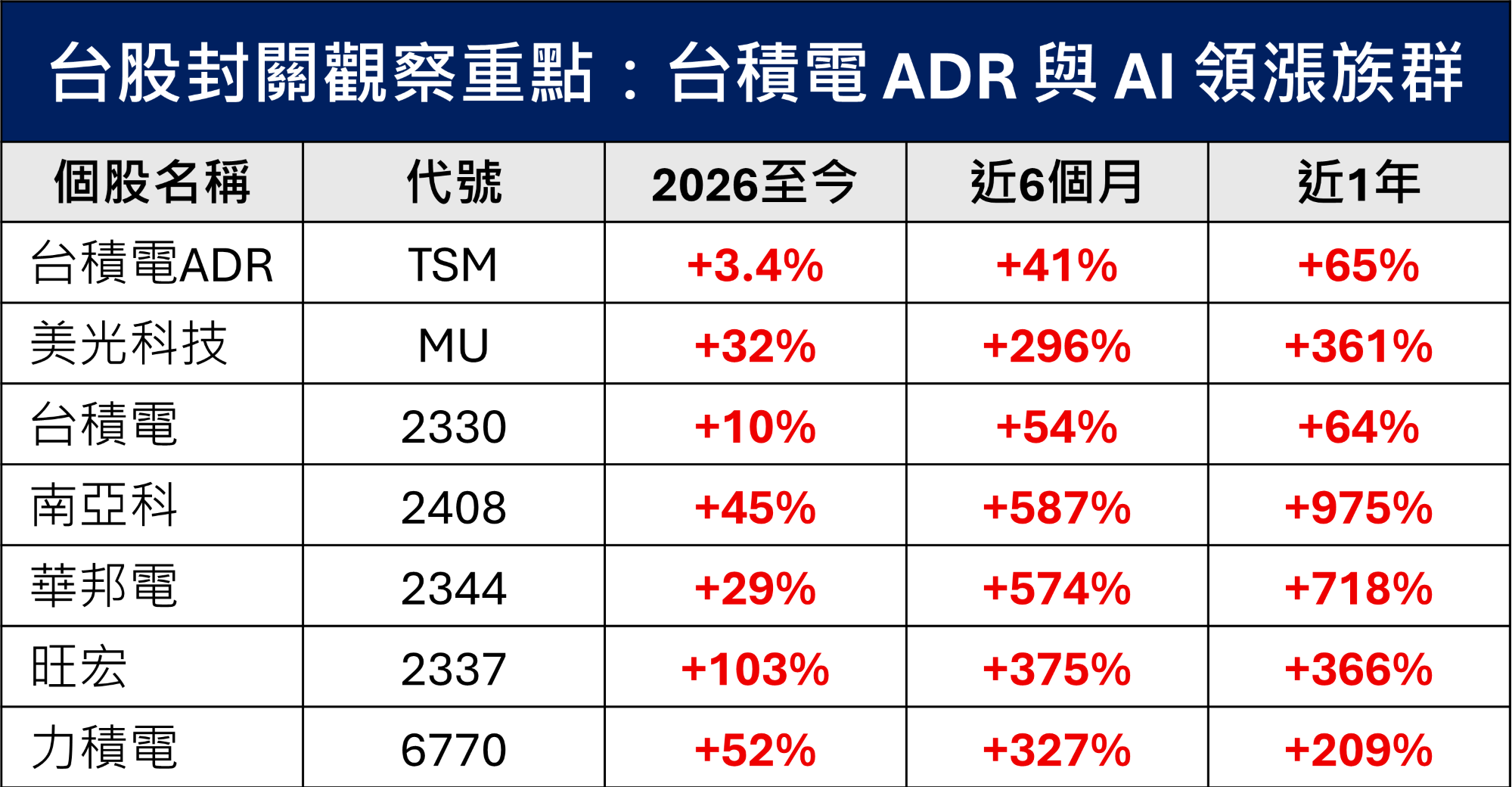 台積電截至 2026 年 1 月占台股總市值比重逾 40%。歷史經驗顯示,台積電 ADR(TSM)在台股封關期間的走勢,與台股開紅盤時的台積電(2330)股價及台股大盤走勢呈現高度正相關。口袋證券說明,在台股休市期間,透過美股帳戶觀察並操作 ADR,可部分掌握台股開紅盤的「先行指標」,並提前布局或避險,無需被動等待台股開盤。