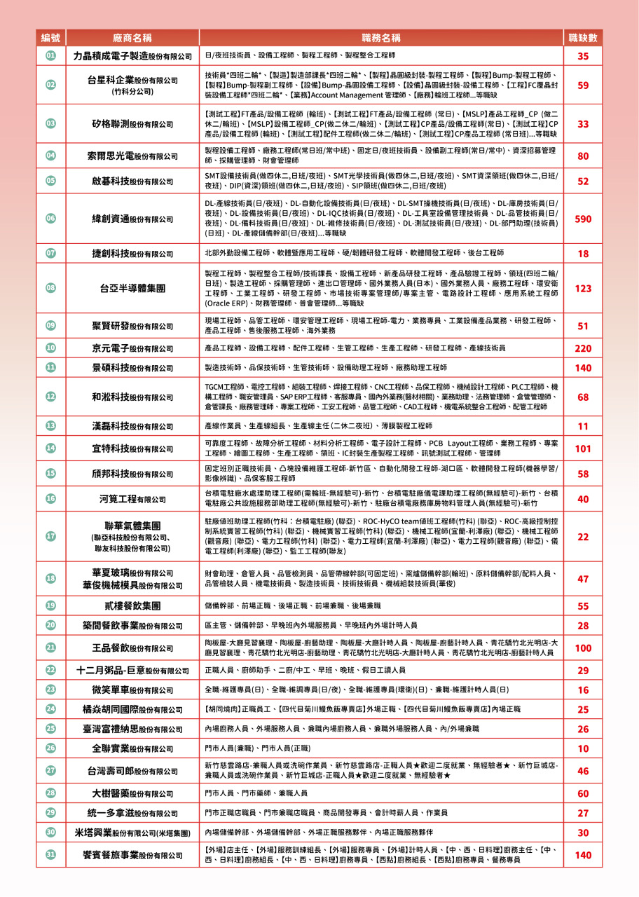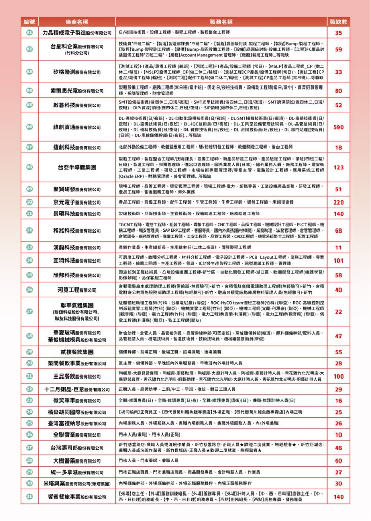桃竹苗分署指出,本次徵才活動從科技業到服務業,紛紛釋出具競爭力的職缺,大樹藥局開出門市人員及藥師職缺,二年以上資歷藥師年薪可破百萬,而且另有獎金制度,緯創資通更一口氣釋出高達五百個職缺。