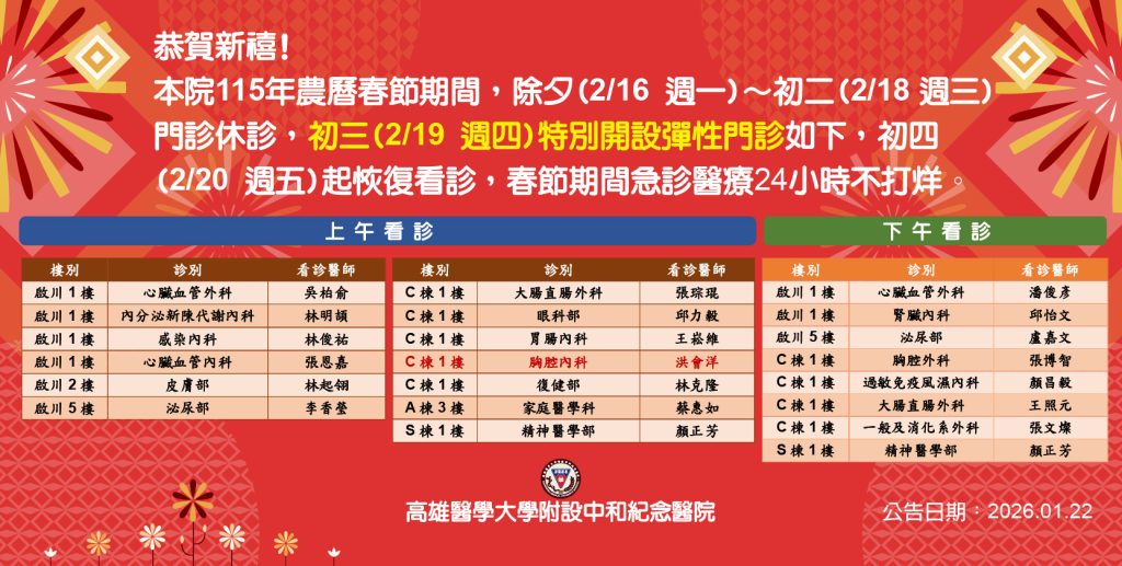 農曆春節假期將至,高醫在春節期間急診、血液透析及住院照常服務;門診及檢查自除夕(2/16)至初二(2/18)暫停,初三(2/19)開設彈性門診,已開放網路與語音掛號;初四(2/20)恢復門診。
