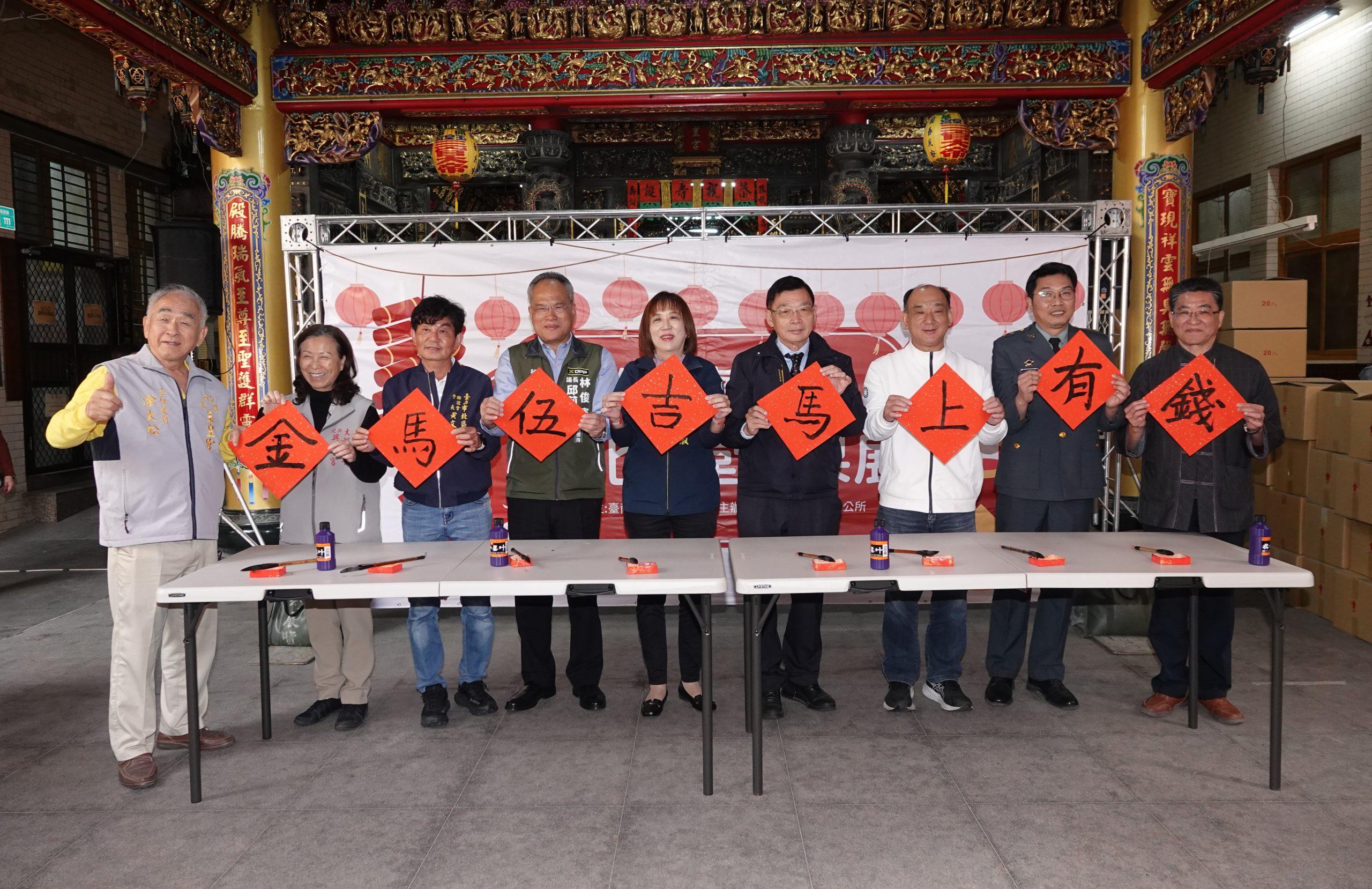 台南副市長姜淋煌率市議員許至椿、興濟宮董事林淑華、糊紙大師吳文進等八位貴賓用毛筆親書「金馬伍吉、馬上有錢」八字春聯向大家賀年。