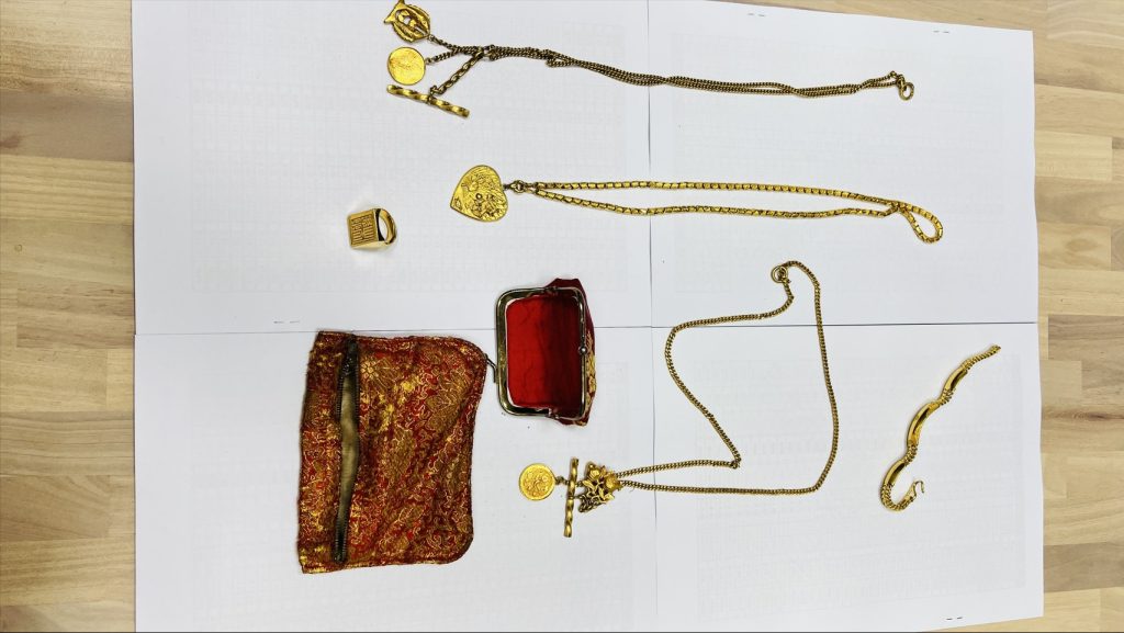 新北市環保局指出,昨日瑞芳區清潔隊機動班隊員胡敏男、蔡憲朋及林秉鴻在執行大型家具預約收運的任務時,依作業流程逐一抽出抽屜檢查,以確保作業安全及民眾有無將貴重物品遺漏。檢視至最下層抽屜時,發現兩件掉落之紅色小包,打開後赫然發現內有金項鍊3條、金手鍊1條以及金戒指1枚。由於近期國際金價處於歷史新高,金飾經秤重合計達7.765兩,換算市值約140萬元。