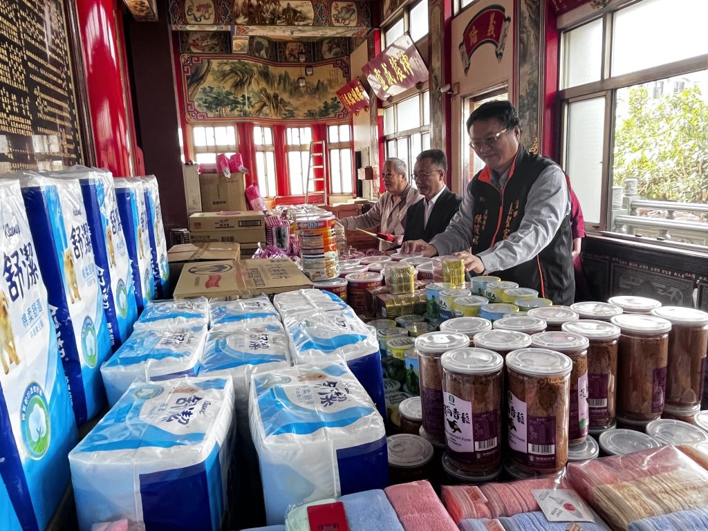 包括官田區長洪聰發、官田里長陳泰興等人,四日一早來到慈聖宮感謝廟方的善心。慈聖宮主委陳俊銘表示,今年共有五十戶的弱勢家庭可獲廟方提供的一千五百元賀年紅包、一千八百元生活物資,讓弱勢家庭感受社會溫暖與支持。