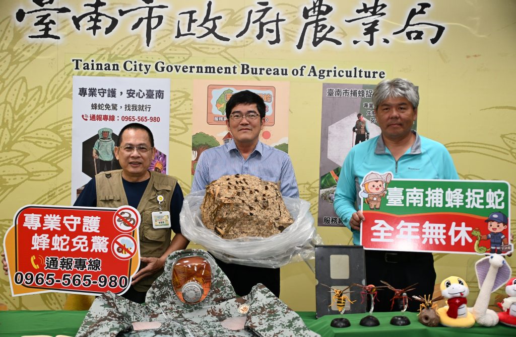 台南市每年捕蜂約四千五百巢,捉蛇約六千隻,全年通報超過一萬件。自一一0年起,由單一廠商專責處理捕蜂捉蛇業務,全年無休,不論市民遇到蜂巢或蛇類出沒,都能立即獲得專業協助。
