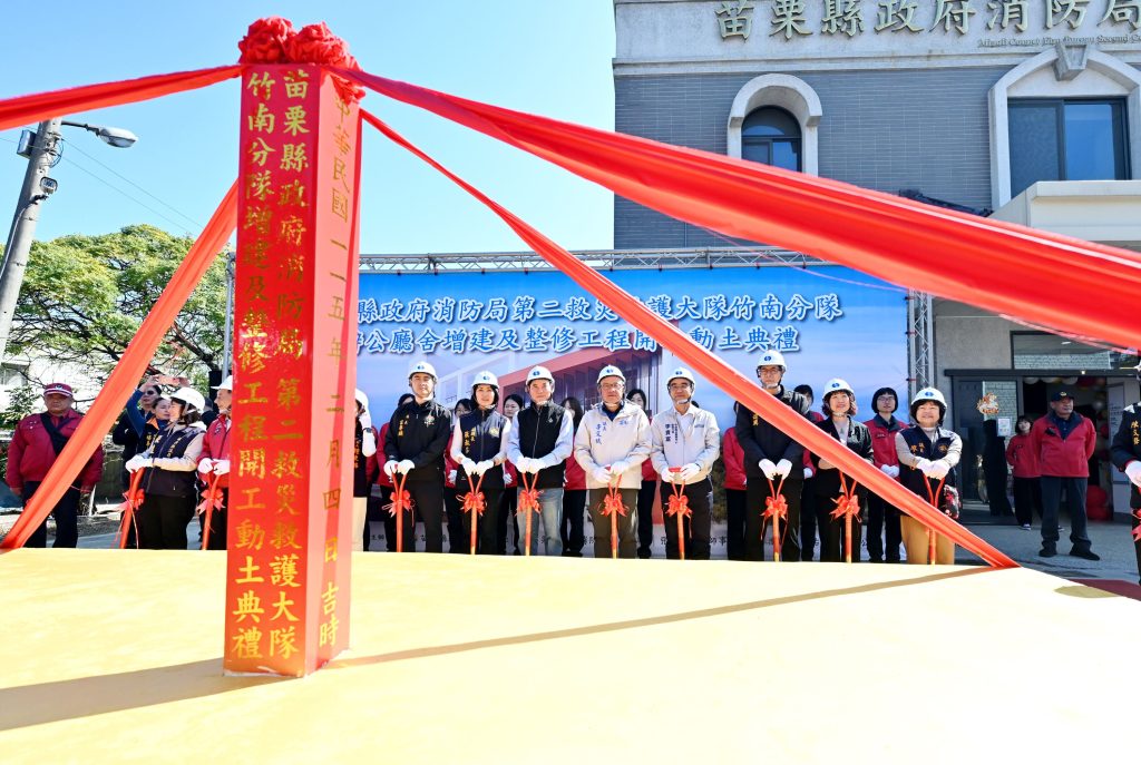 苗栗消防局第二救災救護大隊竹南分隊辦公廳舍增建及整修工程四日動土,新辦公廳舍將興建三樓,與既有廳舍連通,預計一一六年中完工,新辦公廳舍啟用後,各項消防業務推展更見績效,有效防範災害發生,保護地方及民眾生命財產的安全。