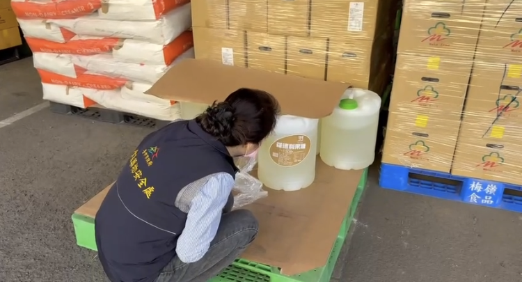 該公司將置於陰涼處的糖漿、奶精等原料存放在半露天的戶外停車場,裝在塑膠桶中的糖漿,高溫三十三度下曝曬長達近一小時,貨車卸貨還占據馬路車道影響交通。