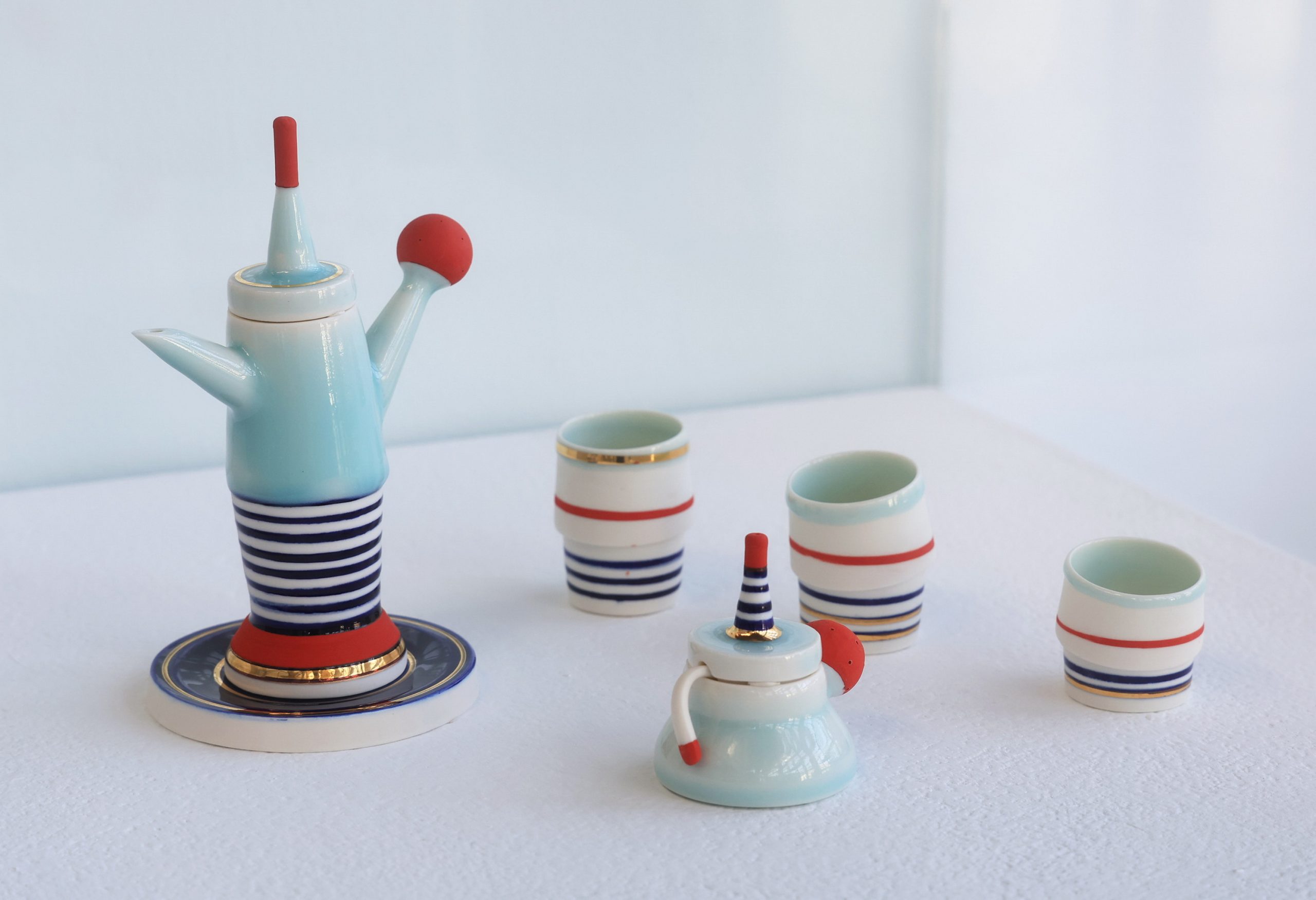 陶博館「第五屆國際咖啡杯大賽」,「金獎」由西班牙瑪爾塔?阿瑪達(Marta Armada)以《大西洋咖啡》脫穎而出,作品以淡雅的青瓷色調結合紅、藍線條,高挑的咖啡壺與環繞杯身的細長條紋,造型宛如跨越空間的橋樑,將喝咖啡的日常儀式與浩瀚的大西洋緊密連結。