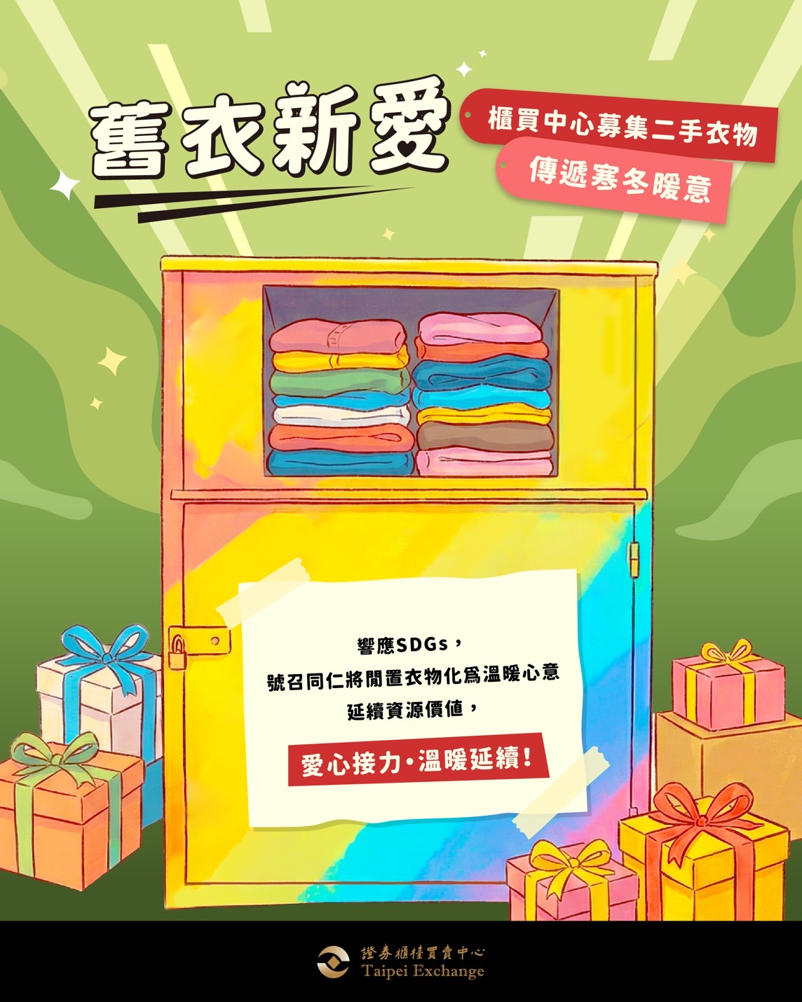 為倡導節能減碳與資源循環再利用,並響應聯合國永續發展目標(SDGs),櫃買中心(Taipei Exchange)於農曆年前發起「舊衣新愛?溫暖傳遞」公益行動,為今年度一系列永續活動揭開序幕。本次活動號召同仁捐贈二手衣物,將愛心傳遞給有需要的家庭,延續衣物使用價值,讓資源發揮更大的效益。
