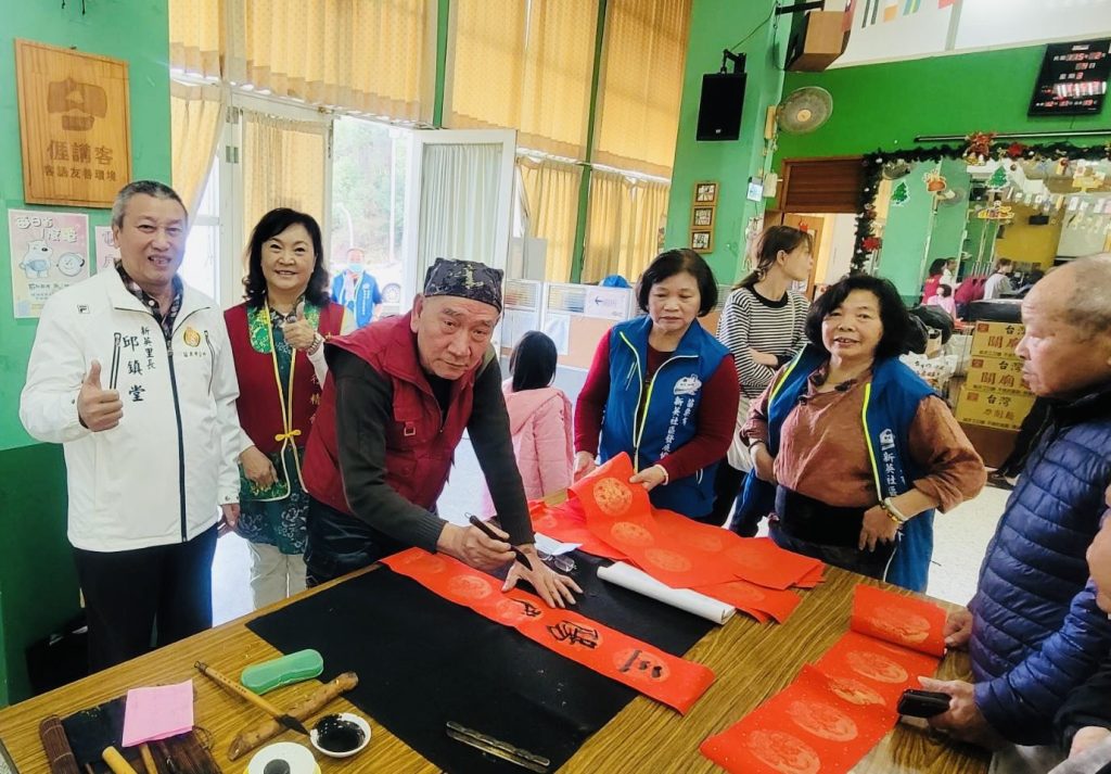 迎新揮毫活動,今年已邁入第三年,活動邀請多位書法名家現場揮毫寫春聯,苗栗市市長余文忠、邱鎮軍立委秘書楊金福、徐筱菁議員、代表會主席陳仁杰助理羅治凱、市民代表劉岳泓、謝承恩、劉鳳瑩、新英里里長邱鎮堂、南勢里里長葉永正、社區發展協會理事長邱仕為等貴賓共襄盛舉,民眾可以在現場挑選喜歡的春聯帶回家,一起感受年節的歡樂氛圍。