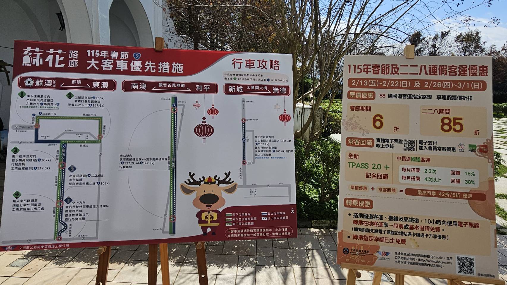 為鼓勵民眾搭乘大眾運輸並紓解國道壅塞,公路局自二月十三日至二十二日推出為期十天的春節優惠措施。內容包含八十八條國道客運路線享原價六折優惠、搭乘國道客運或雙鐵後十小時內轉乘在地客運享一段票免費,以及指定幸福巴士全程免費等。臺北區監理所已協調業者完成運能整備,東區分局更舉辦「蘇花小學堂」抽獎活動,呼籲民眾善用大眾運輸返鄉,既省荷包又能避開車潮。