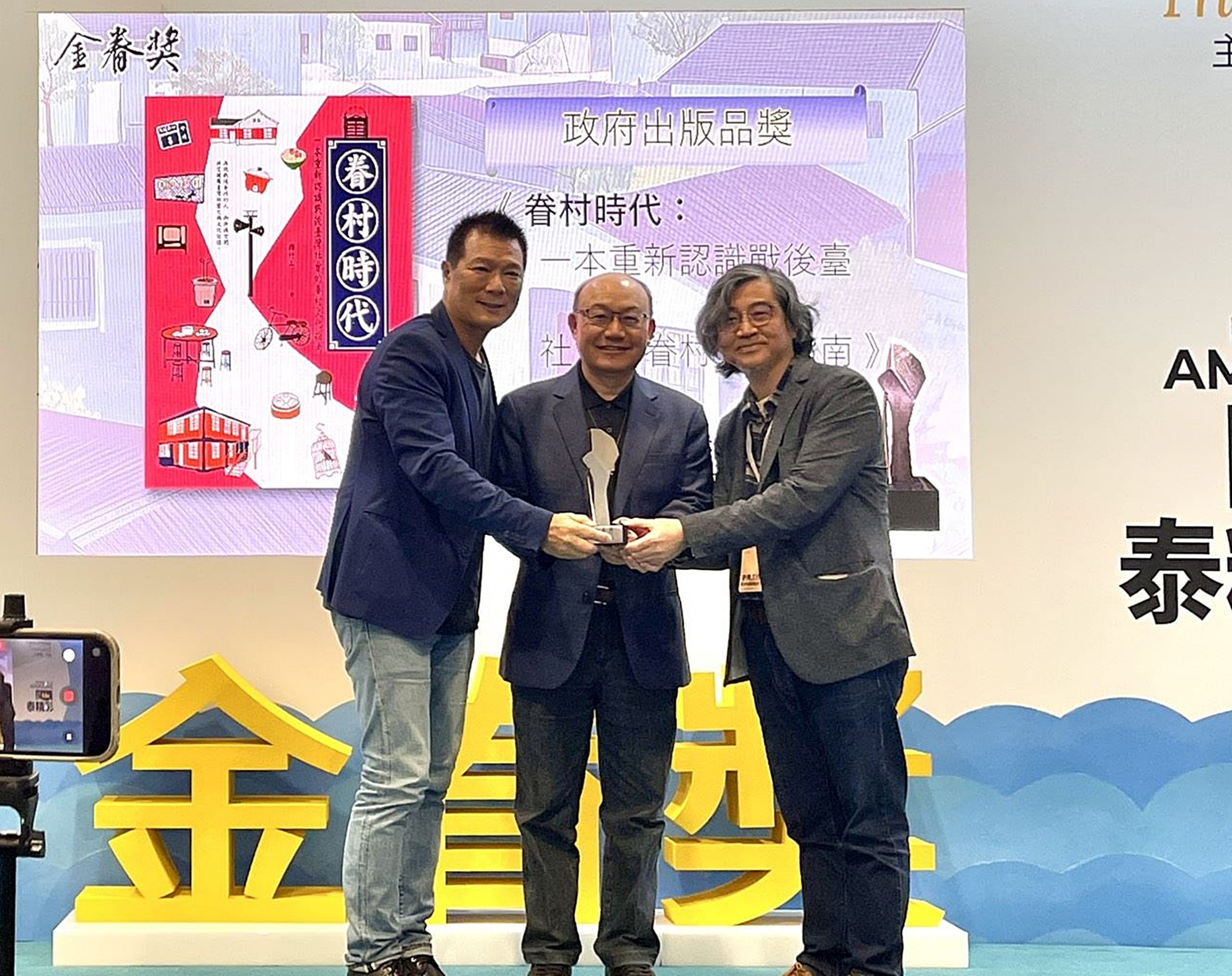由臺北市政府文化局蔡詩萍局長(左)頒發獎盃及獎狀予桃園市政府文化局邱正生局長(中)及蔣竹山教授(右)。(文化局提供)