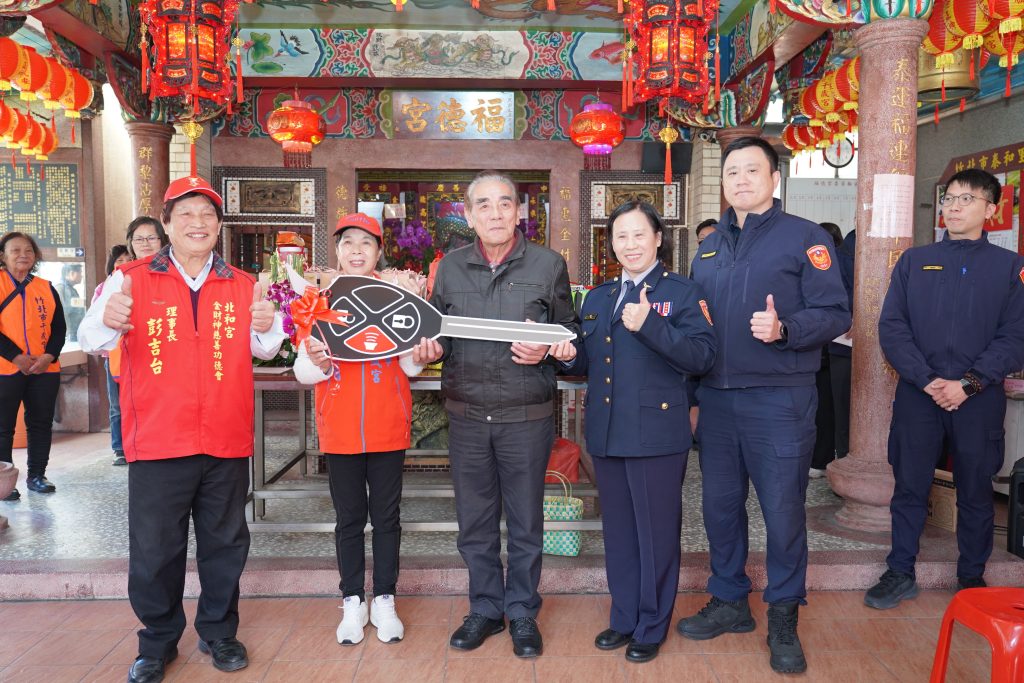 徐元棟接下千歲宮林秀蘭主委及新竹縣金財神慈善功德會彭吉台主委捐贈的大型車鑰匙,轉交給新竹縣警察局副局長邱幼媚及竹北分局長吳學安,徐元棟回贈感謝狀,感謝協助提昇員警執勤安全,強化打擊犯罪的善行義舉,展現地方團體對治安工作的支持與肯定。