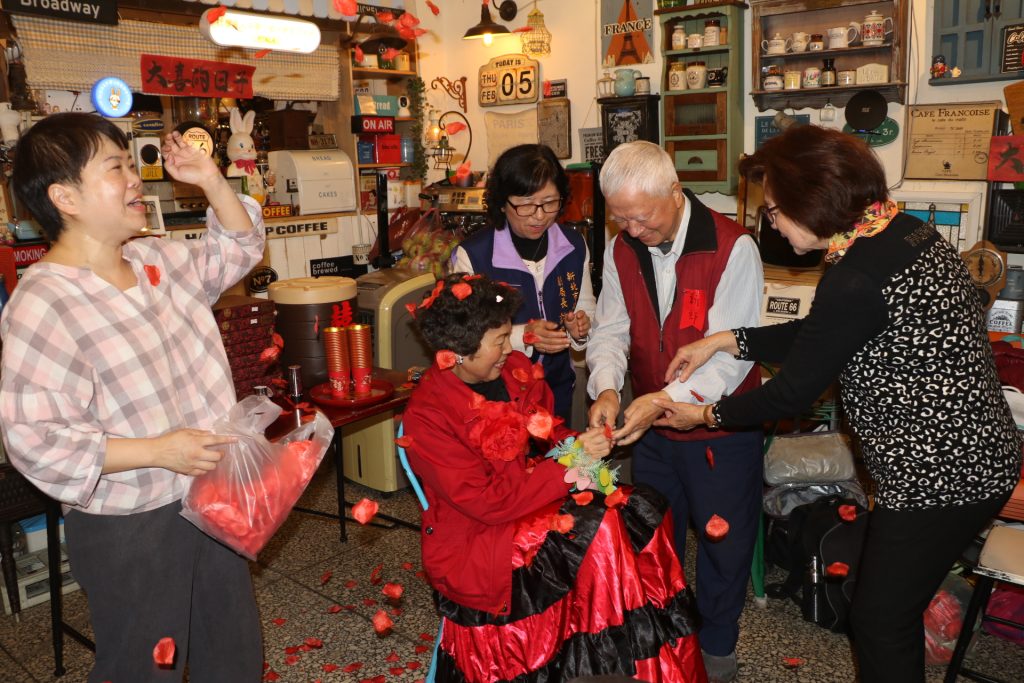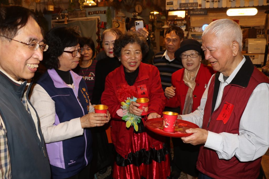 ​為了這場難得的喜事,小兔子據點特別換上「雙星報喜」紅聯,長輩們紛紛盛裝出席,氣氛熱鬧宛如正式婚宴。正哥與寶姐在眾人的祝福下互換戒指,並以傳統茶盤端上甜茶,感謝據點同學與社會局的陪伴。