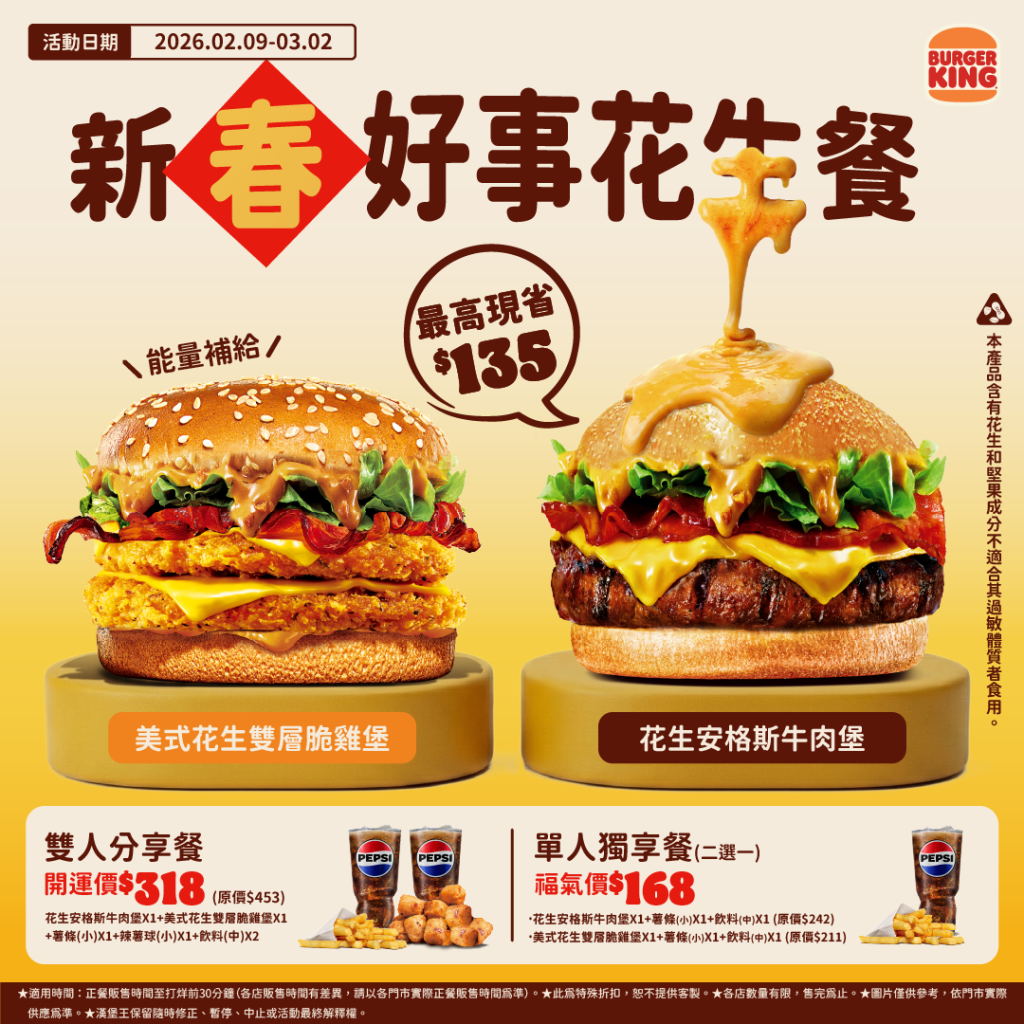兩款花生系列明星產品,花生安格斯牛肉堡及美式花生雙層脆雞堡,本月9日起至3月2日,限時21天,單人獨享餐一律168元,最多可省74元;另外適逢年節親友團聚潮,漢堡王也推出兩款漢堡都吃得到的雙人分享餐,只要318元,一吃就發,現省135元,用優惠價吃飽,就能福運滿滿。