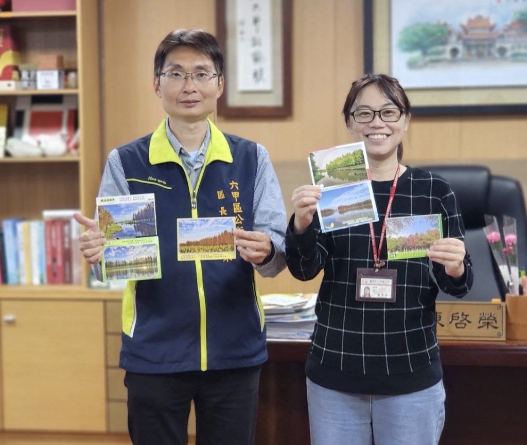 陳啓榮說,這次印製一千套落羽松明信片經費全由六甲旅北鄉親胡瓊櫻捐贈,她希望將美麗的家鄉介紹給更多人認識,並讚揚六甲區公所行銷在地文化觀光很成功。