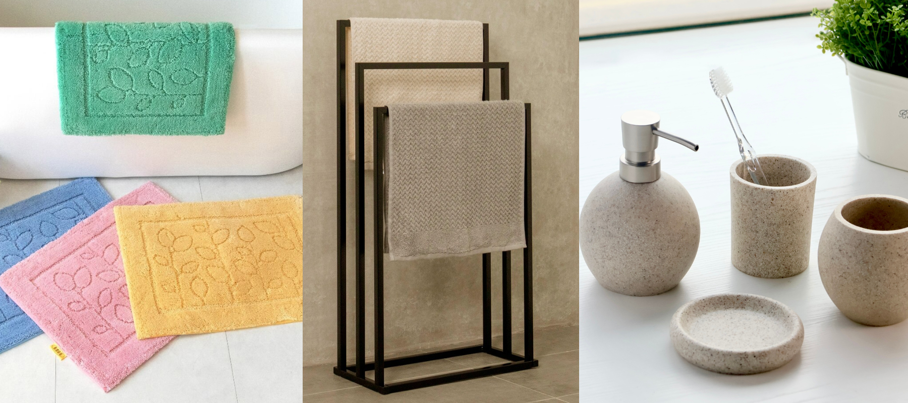 浴室美學的核心在於極簡與清爽,建議將70%的瓶罐收納於櫃內或統一分裝,剩下的30%空間,則是大膽混搭地墊、金屬、石器等異材質來營造精品飯店的現代感。要翻轉浴室的廉價感,首推日本OKA銀離子抗菌防臭地墊,它徹底取代傳統毫無美感的抹布式墊子,以鮮豔色彩定調空間亮點,即便地板淨空,也能靠純淨腳感與視覺張力撐起質感;針對狹窄的立面,ikloo三桿毛巾架利用俐落的金屬線條,將原本厚重的儲物需求,透過垂直設計轉化為如精品飯店般的展示區域,讓衛浴動線更輕盈、具層次感;最後洗手台面的細節交給享樂思石紋衛浴系列,其柔和石紋與流順線條,讓原本平凡的皂盤、漱口杯搖身一變成精緻視覺裝飾。