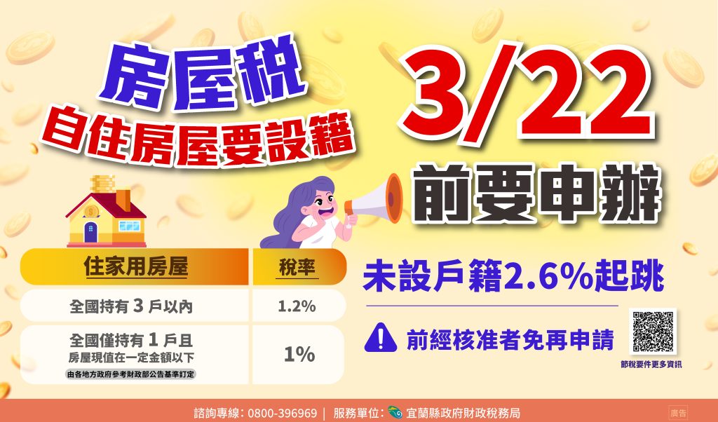 房屋稅2.0新制規定,自住房屋必須「本人、配偶或直系親屬辦竣戶籍登記」才能適用自住房屋優惠稅率,宜蘭縣財稅局呼籲納稅義務人檢視名下自住房屋是否已辦竣戶籍登記,如未設立戶籍,務必於今年三月二十二日以前(適逢假日,順延至三月二十三日)辦竣戶籍登記並提出申請,以維護自身權益。