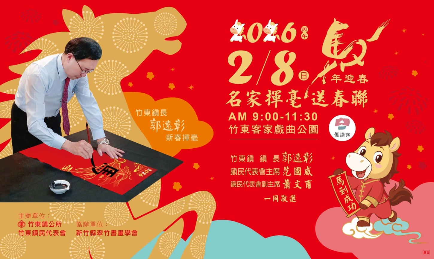 農曆春節將屆,新竹縣竹東鎮公所將於本週日在竹東客家戲曲公園舉辦二0二六「馬年迎春,名家揮毫送春聯」活動,邀請十位書法名家現場揮毫,民眾只要說一句客家話,即可免費領取客製化春聯,限量一千份。