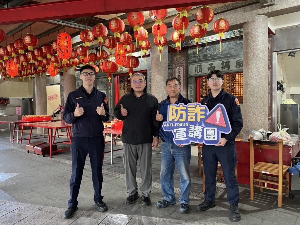 農曆春節將近,為防範年節期間竊盜及詐騙案件發生,市警四分局安樂派出所五日下午三點左右,由所長陳品碩率同警員陳君瑋,走訪轄內宮廟及銀樓等重點場所,辦理年節防竊及反詐騙宣導,以維護轄區治安。
