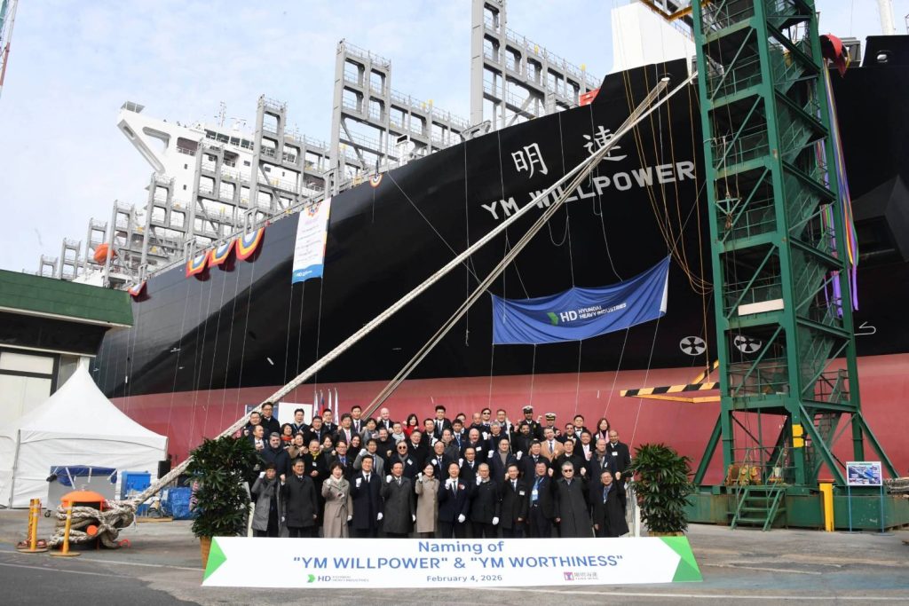 陽明海運貨櫃船隊再添生力軍,該公司委由韓國HD現代重工業株式會社(HD現代重工)建造之五艘15,500 TEU級LNG雙燃料系列貨櫃輪,本(二)月四日在HD現代重工蔚山船廠舉辦首兩艘「連明輪」(YM Willpower)及「年明輪」(YM Worthiness)新船命名典禮。