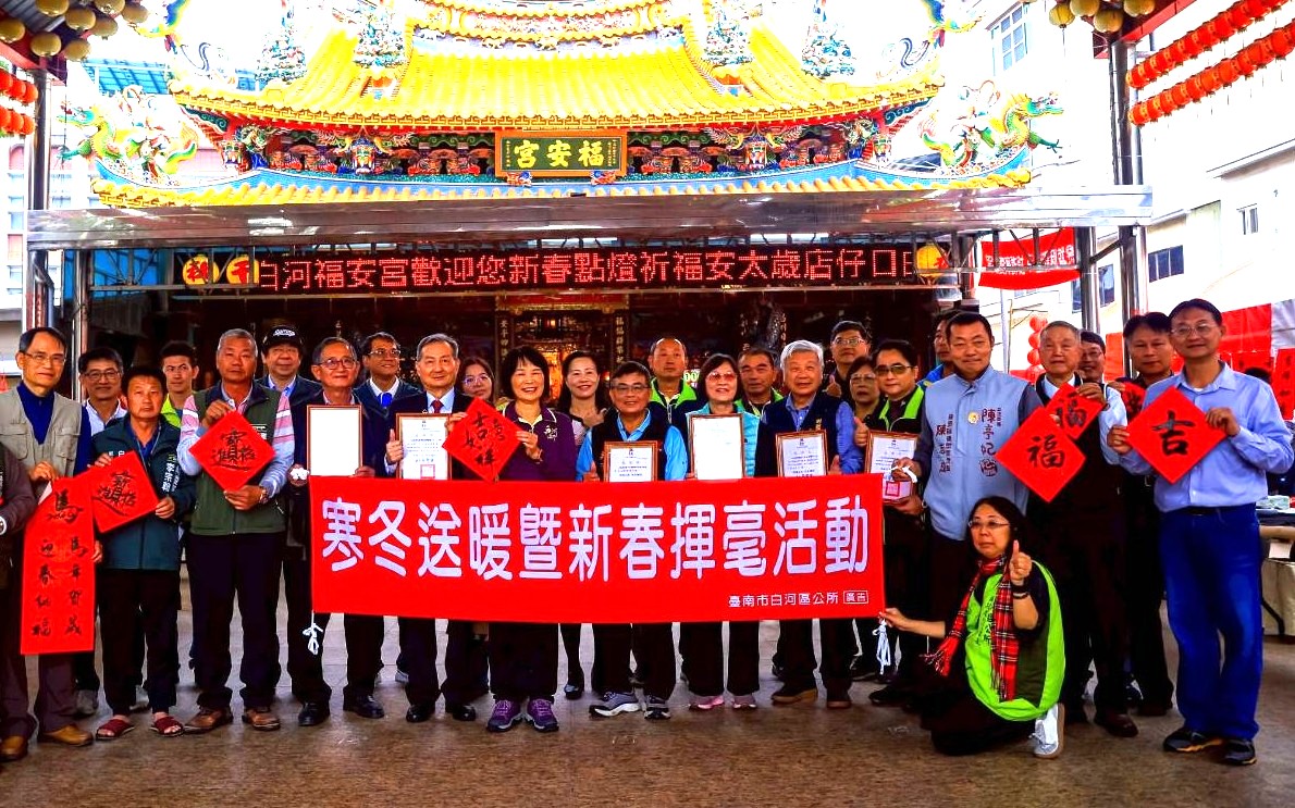 農曆春節即將來臨,為迎接金馬呈祥,白河區公所二月六日上午在店仔口福安宮廟埕廣場舉辦「寒冬送暖暨新春揮毫活動」,吸引五百多民眾參與,現場喜氣洋洋熱鬧滾滾。