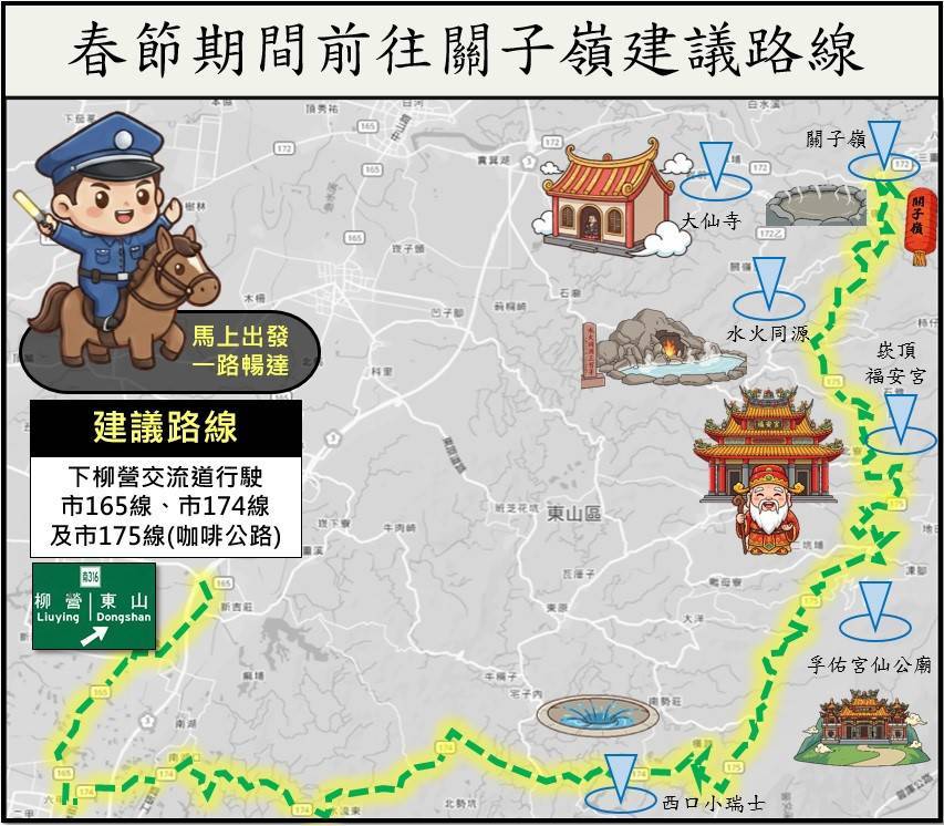 春節暢遊關子嶺行車路線,白河警報給你知。(白河警分局提供)