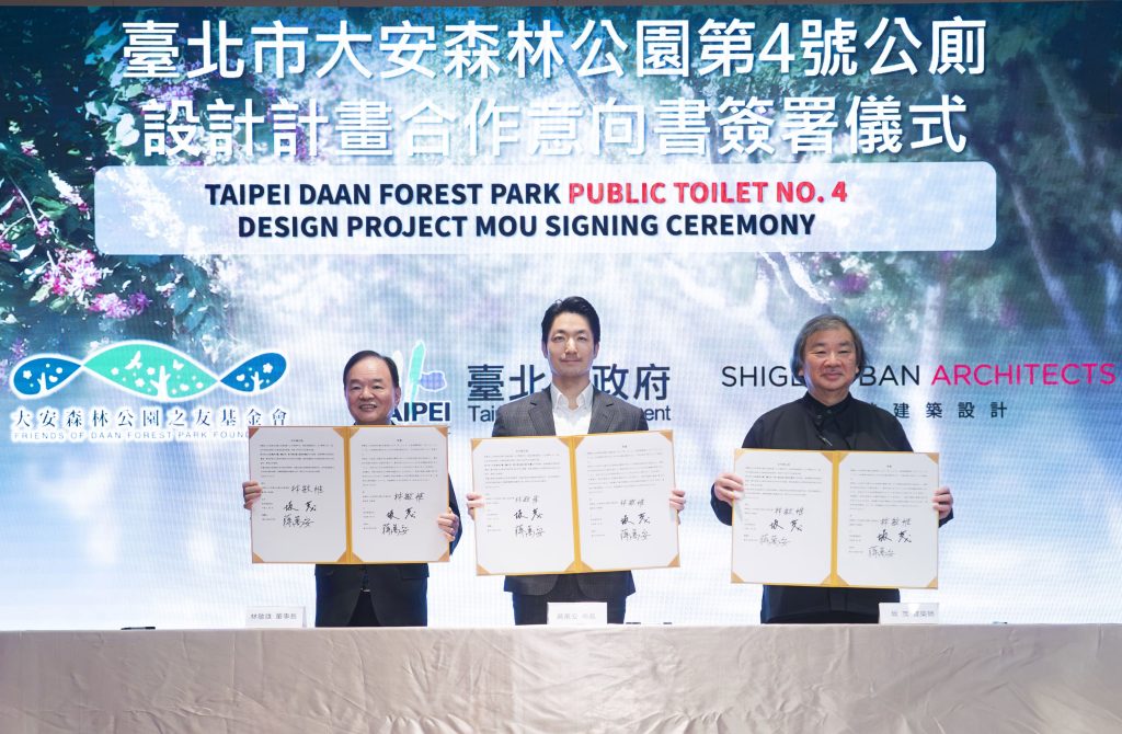 臺北市公共空間再跨大步,迎來跨國合作新里程!大安森林公園之友基金會攜手日本普利茲克獎建築大師坂 茂,以大安森林公園「4號公廁」設計計畫為起點,導入其在人道建築與公共設施設計上的專業經驗,推動全齡友善與永續理念。為宣示計畫正式啟動,6日舉辦合作備忘錄簽署儀式,由大安森林公園之友基金會董事長林敏雄與坂 茂建築師共同簽訂,並邀請臺北市長蔣萬安出席見證,三方共同宣示翻轉如廁文化、帶動城市美學向前的決心,開啟城市文明新篇章。