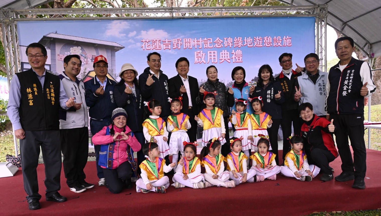 花蓮縣政府表示,為推動文化資產活化並提升社區生活品質,七日在吉安鄉舉行「吉野開村記念碑綠地遊憩設施啟用典禮」,透過專業的古蹟保存技術與公共空間營造,將具有百年歷史意義的縣定古蹟與現代遊憩設施結合,讓歷史場域轉化為兼具教育與休閒功能的綠色空間,重新融入民眾的日常生活。