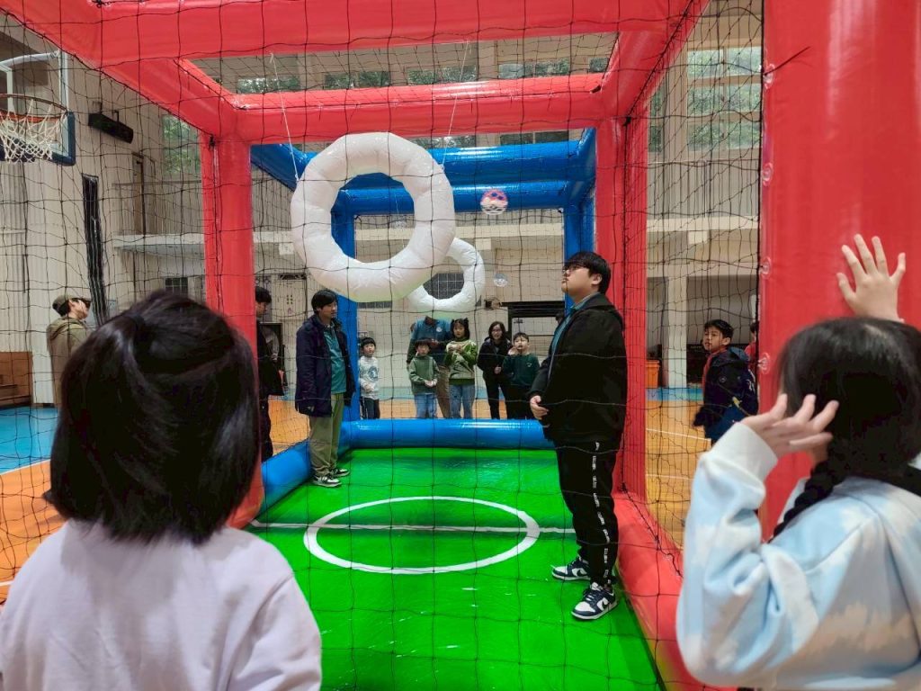 營隊將「無人機飛行技術」與「足球競技規則」創新融合,一顆顆外型宛如足球的球型無人機在空中高速穿梭、精準射門,孩子們緊盯場上動向、隨時調整操控策略。(正濱國中提供)