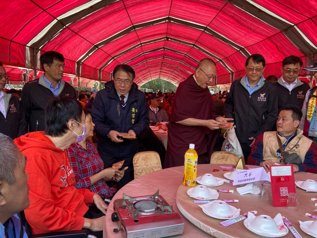 台南市左鎮區噶瑪噶居寺八日舉辦連續十四年的「佛祖請吃飯─扶弱濟貧」慈善活動,市長黃偉哲與創辦人洛本天津仁波切一起發送紅包和禮物給一千三百零一名參與歲末餐敘受關懷的老少民眾,更席開一百三十一桌,讓佛祖請大家吃飯,並送上祝福。