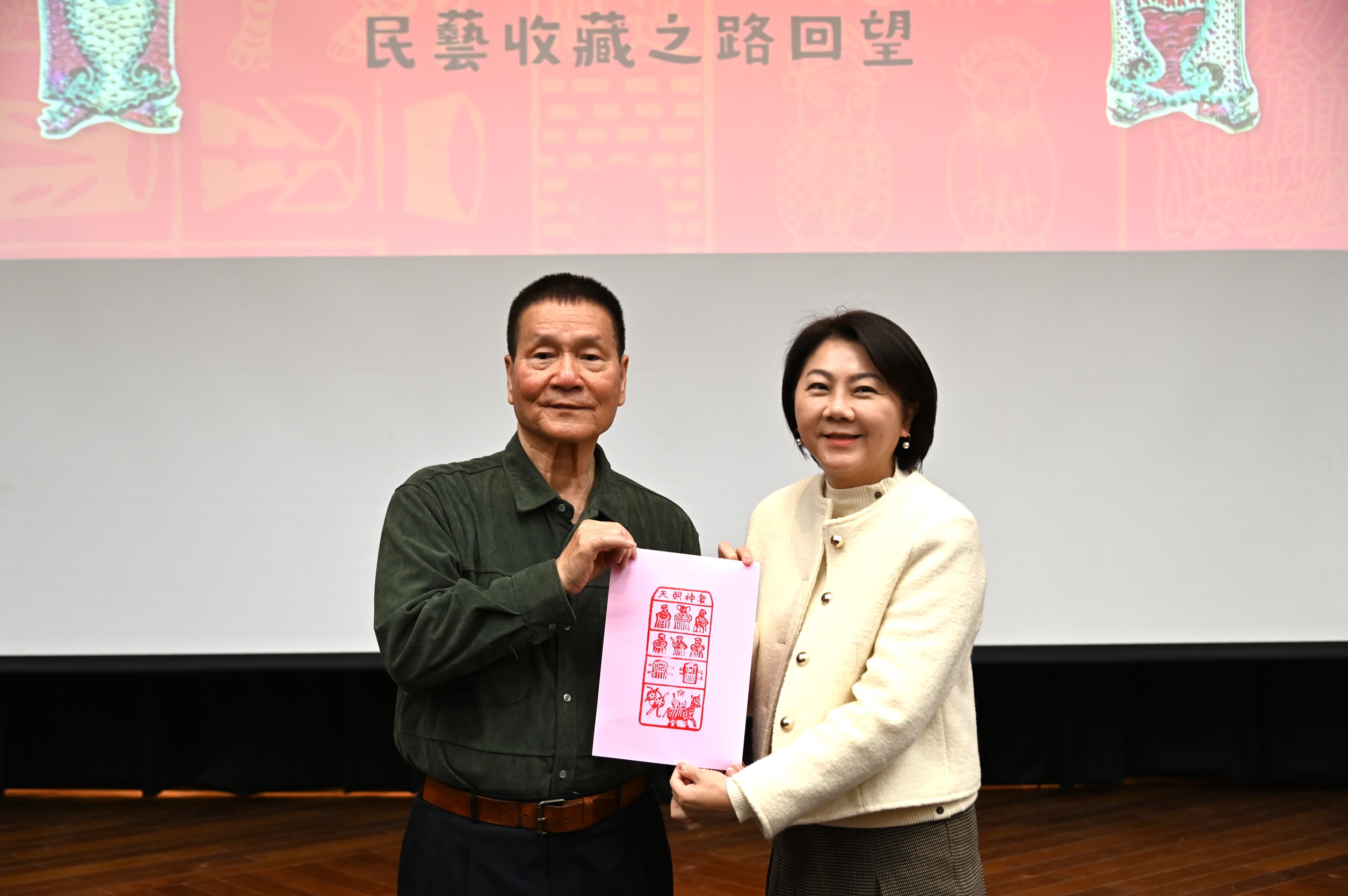 為推廣地方文化保存與民俗文物研究,宜蘭縣史館八日邀文化局長黃伴書主持「以歲月拍版─莊建緒民藝收藏之路回望」新書發表會,並贈送與會貴賓、鄉昔日農曆春節時黏貼於門楣的五福符。