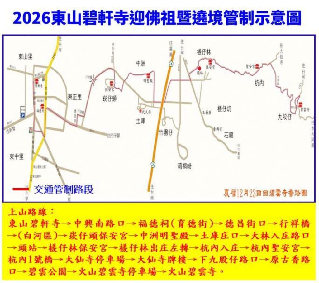 國家重要民俗「東山迎佛祖」送駕儀式將於二月十日清晨舉行,白河警分局當天將於沿途實施交通管制,呼籲車輛駕駛人配合改道。