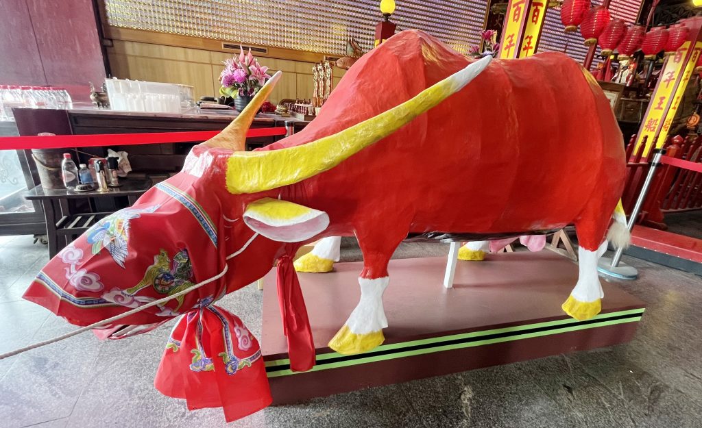 正統鹿耳門聖母廟「迎春牛」有四十多年歷史,廟方委託道長吳文進製作丙午年春牛及芒神(牧童),農曆大年初一起將擺在五王殿前供摸春牛祈福,祈求新的一年諸事大吉。