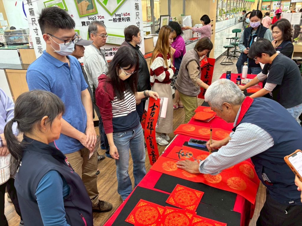 屏東郵局於日前在屏東民生路郵局營業廳,邀請多位本地書法名家於現場大筆揮毫,將吉祥的祝賀話語寫在春聯上,免費贈送給民眾,許多用郵顧客及路過民眾請名家書寫想要的賀詞,將帶有傳統年節氣息的吉祥春聯帶回去佈置,期望在馬年萬事吉祥。