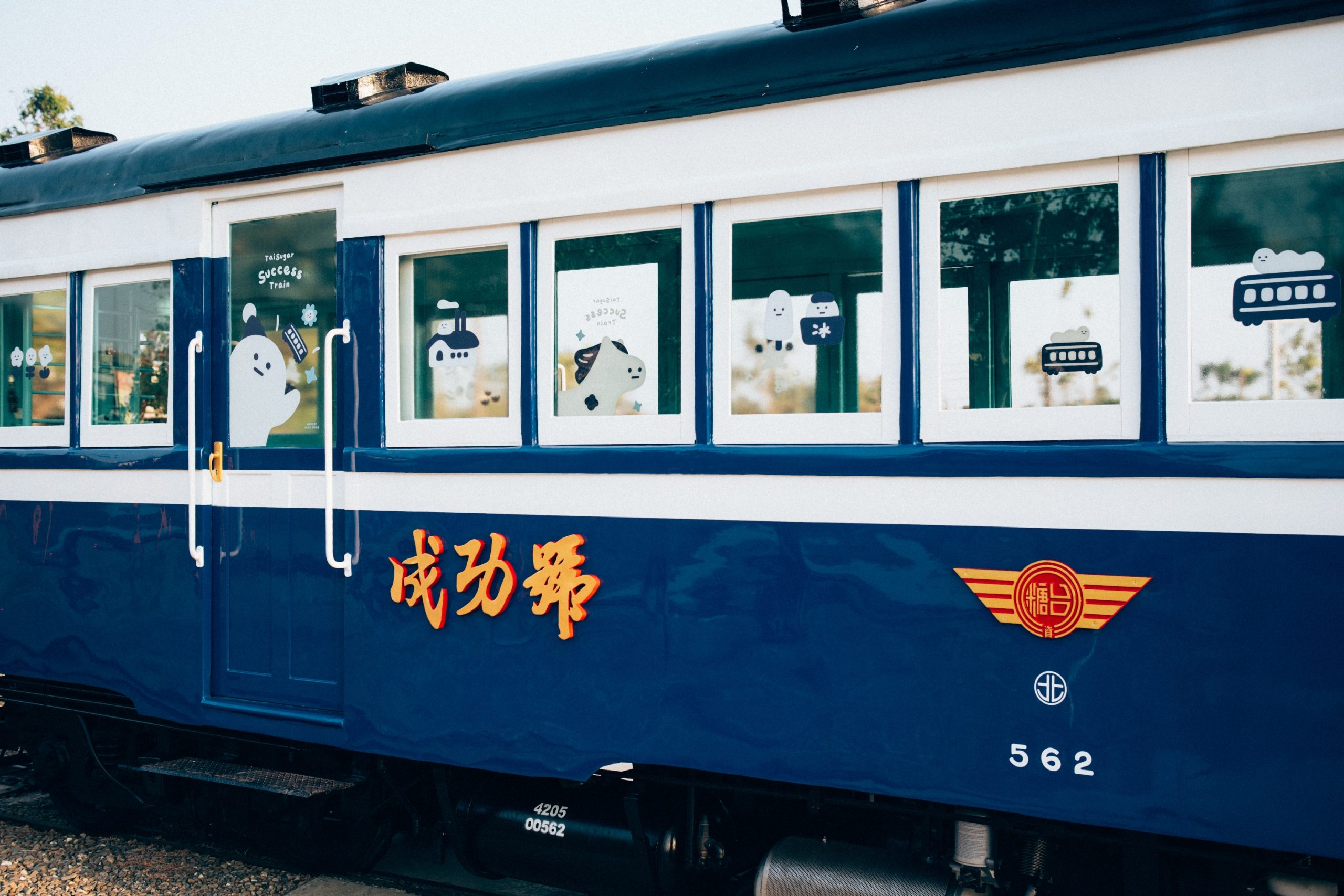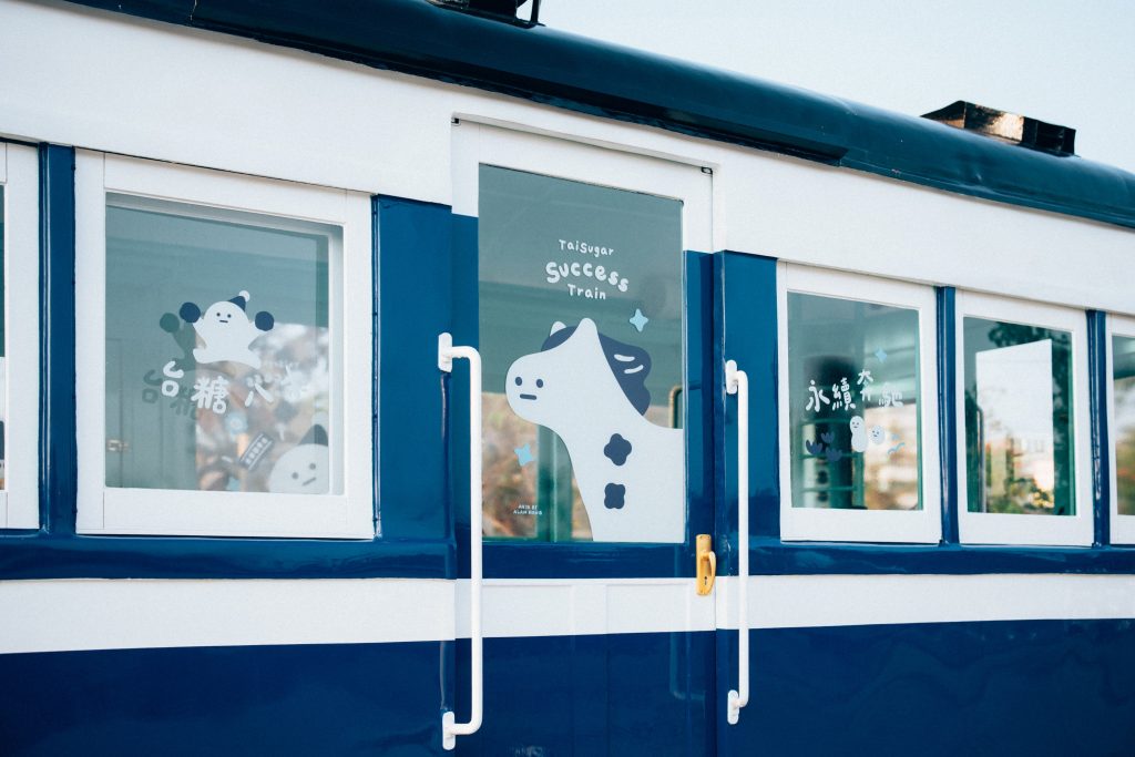 「成功號」與「勝利號」糖鐵五分車化身超萌車廂,圓潤、純白的AH!Q躍上車窗,帶領乘客穿梭於新營的城市與綠廊間。
