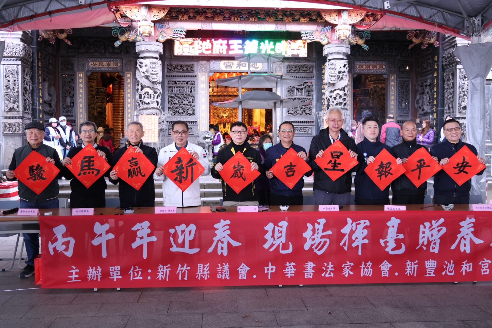 春意入墨、文化入心,農曆春節前夕新竹縣議會、中華書法家協會與新豐池和宮共同主辦「丙午年迎春,現場揮毫贈春聯」活動,新竹縣長參選人、副縣長陳見賢與新竹縣議會議長張鎮榮到場共襄盛舉,與書法名家一同揮毫,向鄉親傳遞新春祝福,也為地方文化注入濃濃年味。