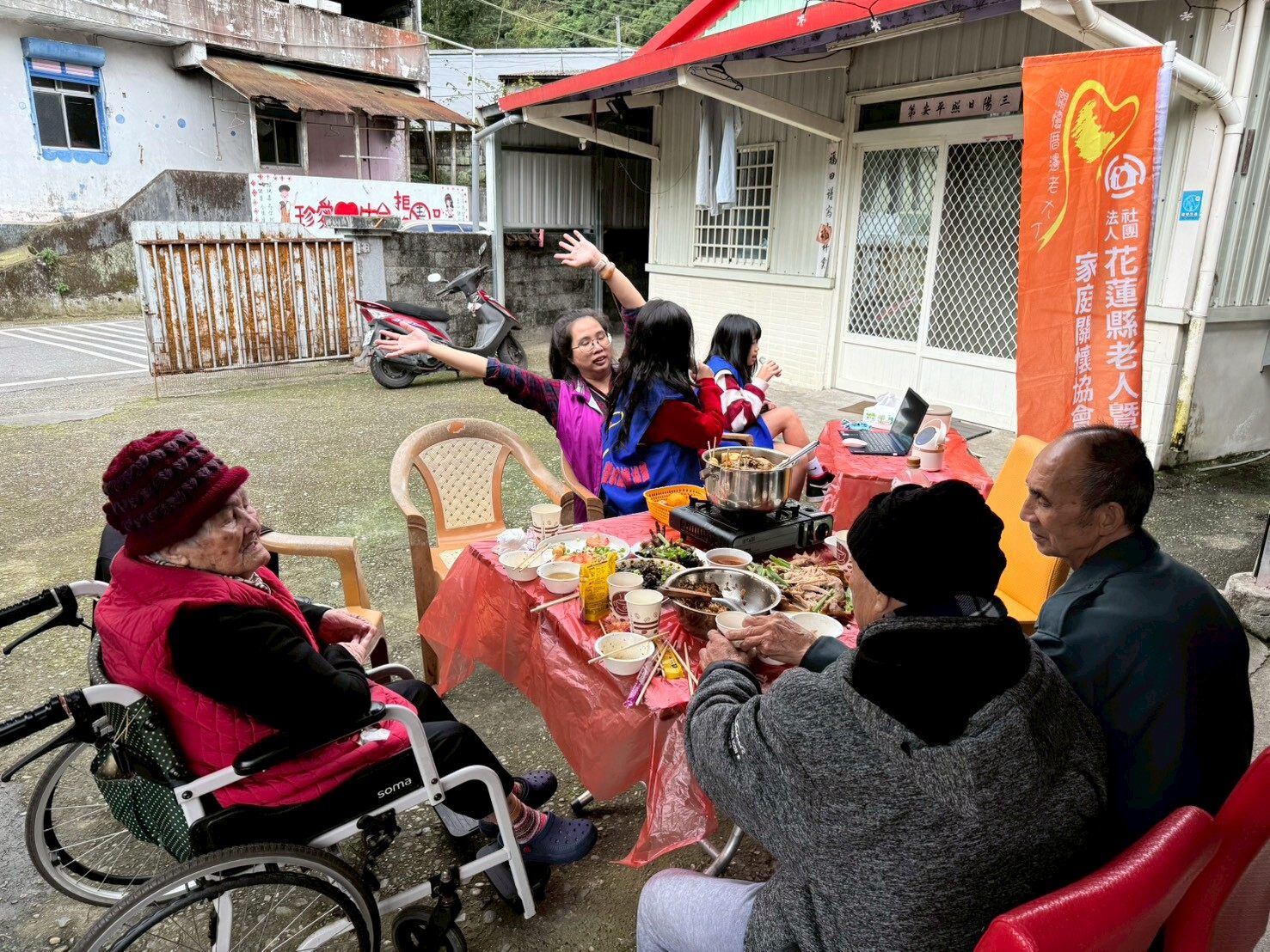 農曆年前,社團法人花蓮縣老人暨家庭關懷協會辦理「春節送暖‧到宅圍爐」活動,由社工準備年菜到外出不便的弱勢長者家中親手料理,並邀附近個案同樂,熱鬧圍爐享用豐盛美味的愛心年菜。